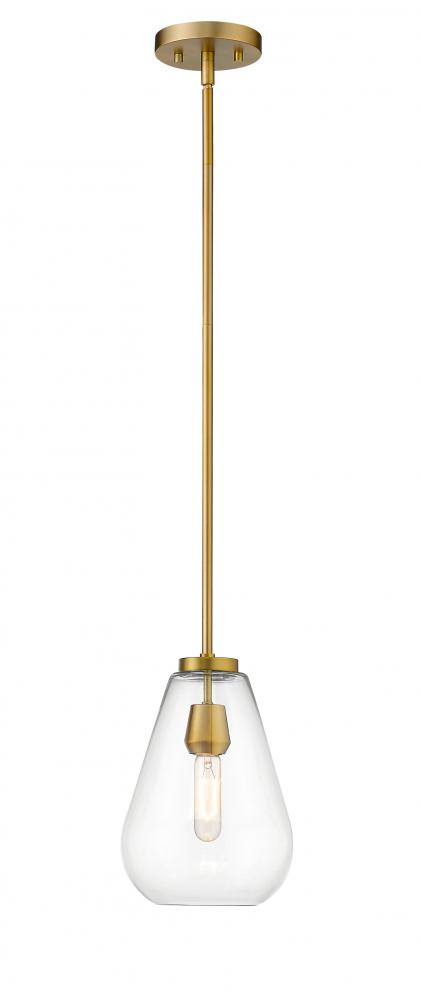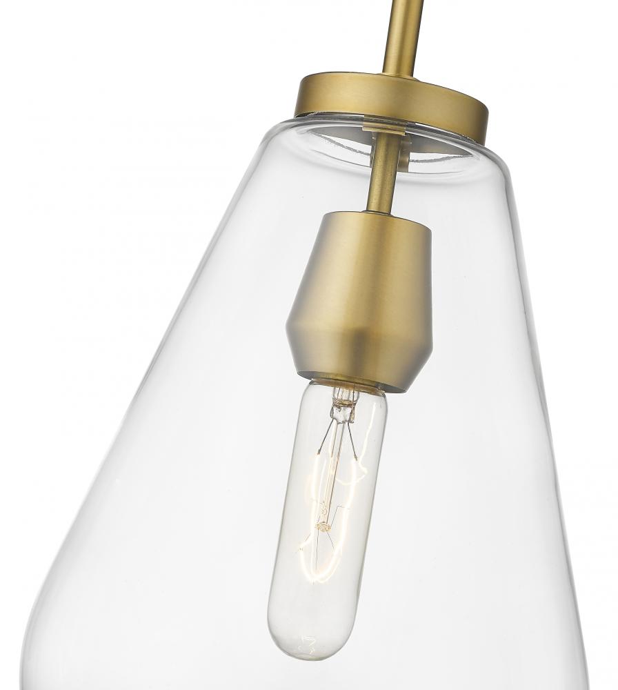 An eye-catching one-light pendant perfectly encapsulates the modern aesthetic. The tapered bell-shaped shade is made from clear glass, suspended from a steel frame with a sleek olde brass finish. The fixture brings a chic cutting edge to a contemporary kitchen or dining room.