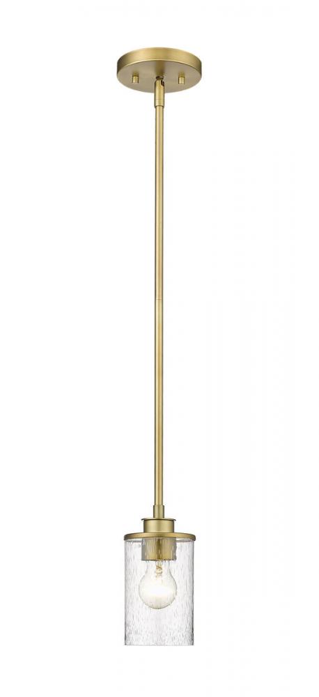 An air of simplicity creates sophistication and style in a modern or transitional space when this one-light mini-pendant shows off its classic elegance. This mini-pendant from the Beckett collection reflects a hint of nautical influence, blending an olde brass finish steel mount and down rod with a single cylindrical clear seedy glass shade. Bring ambient lighting to a targeted space, illuminating a dinette set, hallway, or breakfast nook.