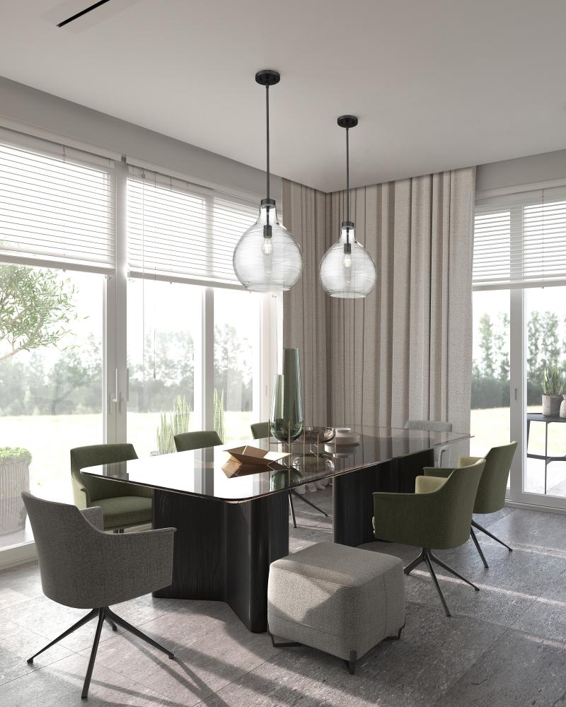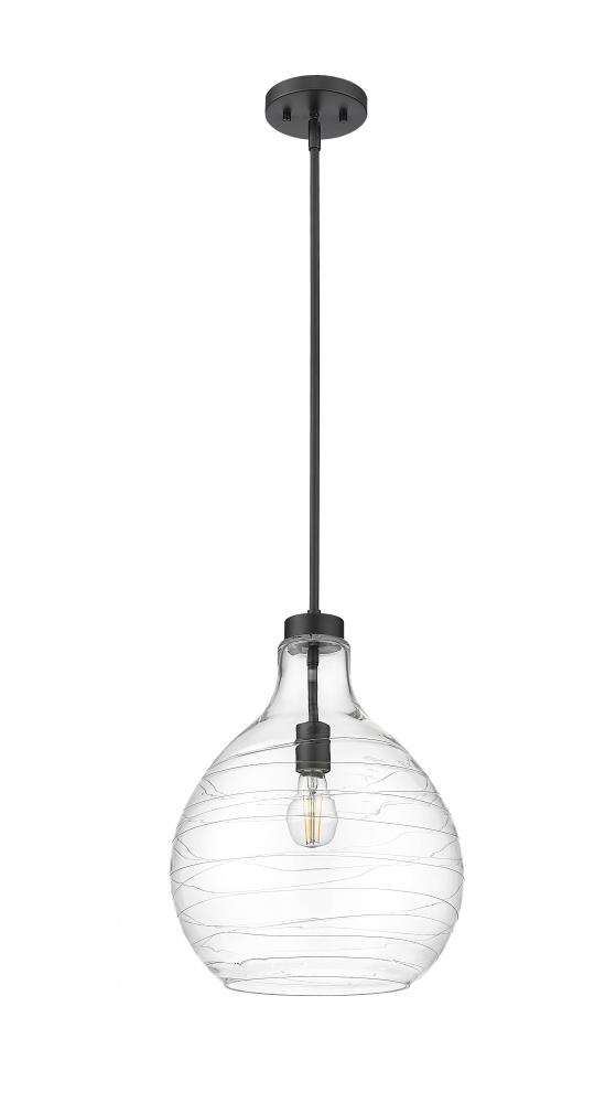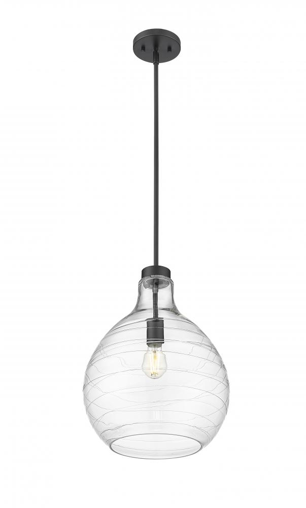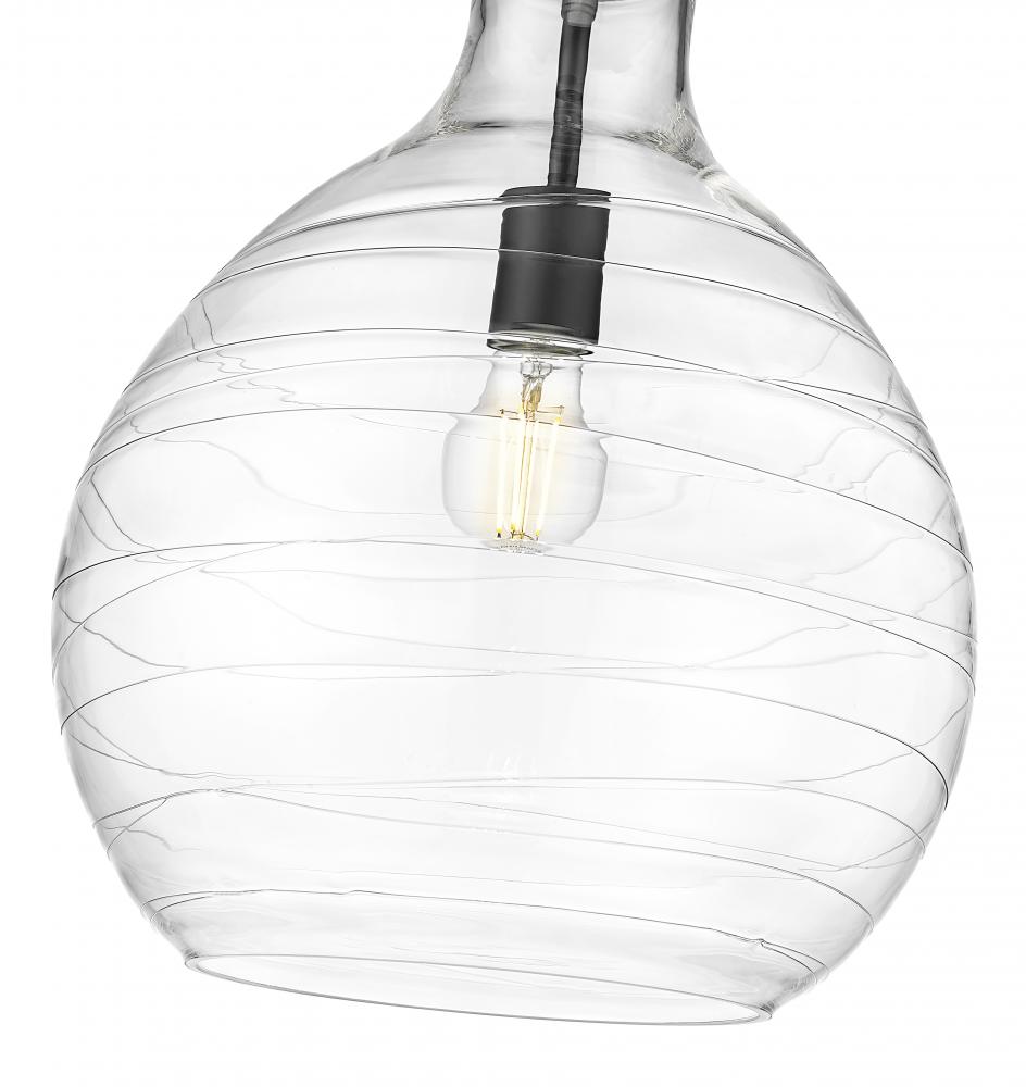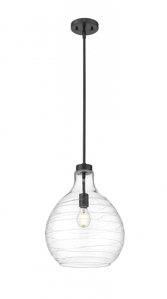 Curvy clear glass is accentuated with an artisan ribbon effect on a modern one-light pendant that makes a statement in your kitchen or living room. Bold in matte black, it boasts a crisp, clean silhouette that brims with character as the dimensional shade refracts light to reduce glare and create an inviting ambiance in your home.
