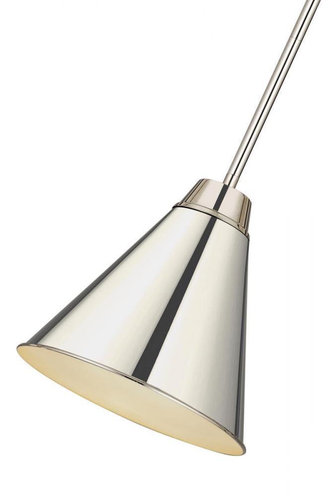 A customized kitchen or living space deserves fashionable lighting fixtures, and this one-light pendant from the Eaton collection delivers. This sleek, simple light offers a minimalist design with a cone-shaped shade, down rod, and canopy mount crafted of iron with a shiny polished nickel finish. Mount this light straight-up or on a sloped ceiling.