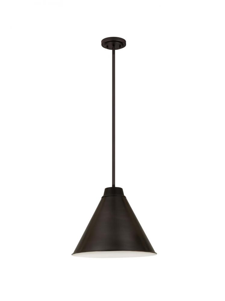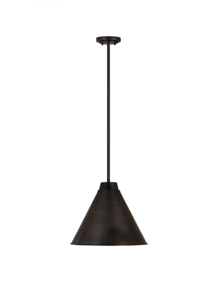 Choose an industrial-inspired look with the Eaton one-light pendant, a superb option for low-key lighting in a custom space. This pendant features a sleek conical silhouette with a shade, down rod, and canopy crafted of iron and given a bronze plate finish. Line up a collection to illuminate a kitchen island, or place this light individually around a living space for an easy, casual feel.