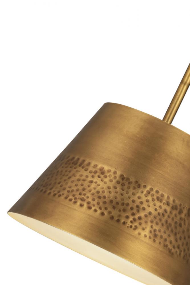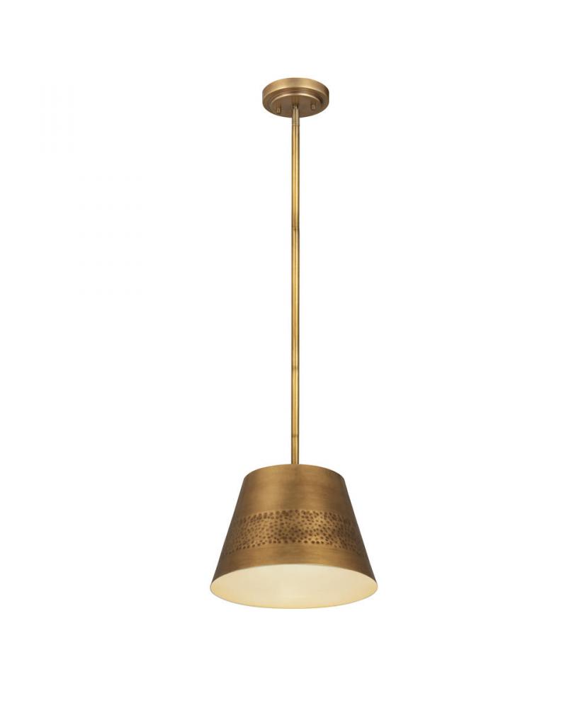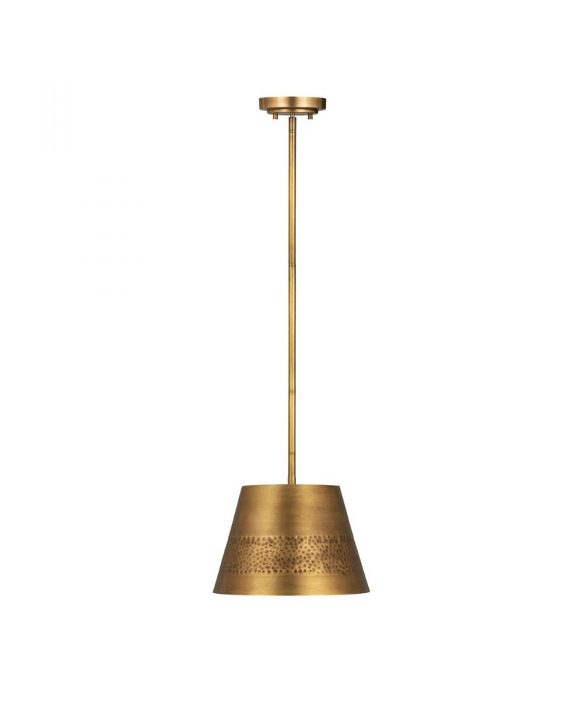 Take lighting in a new direction, weaving it into central d?cor elements within a custom casual space. The Maddox one-light pendant delivers sophistication with a laid-back feel in a conical shade, down rod, and canopy crafted of rubbed brass finish iron. Its shade?s hammered belt detailing adds texturizing to up the ante on sleek design.
