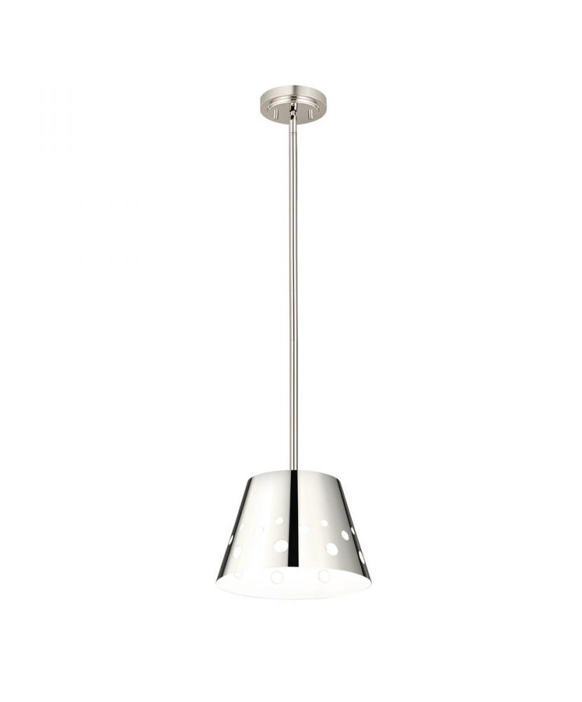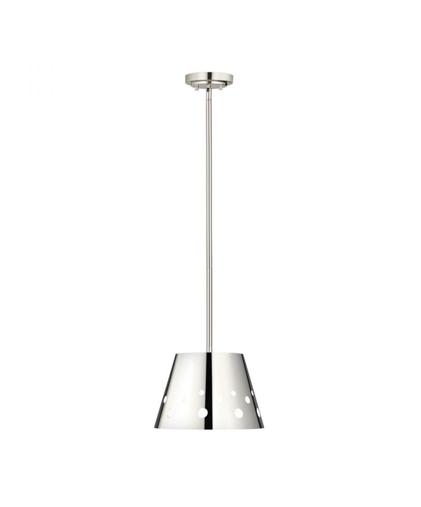 The festive design of the Katie one-light mini-pendant offers inspiring attitude to dress up a casual space. Crafted of lustrous polished nickel finish iron, this delightful fixture features a sleek conical shade with cutout holes that let light shine through. Punctuate a favorite dining space, kitchen, or nook with this pendant that offers adjustable hanging lengths and may be mounted on a sloped ceiling.