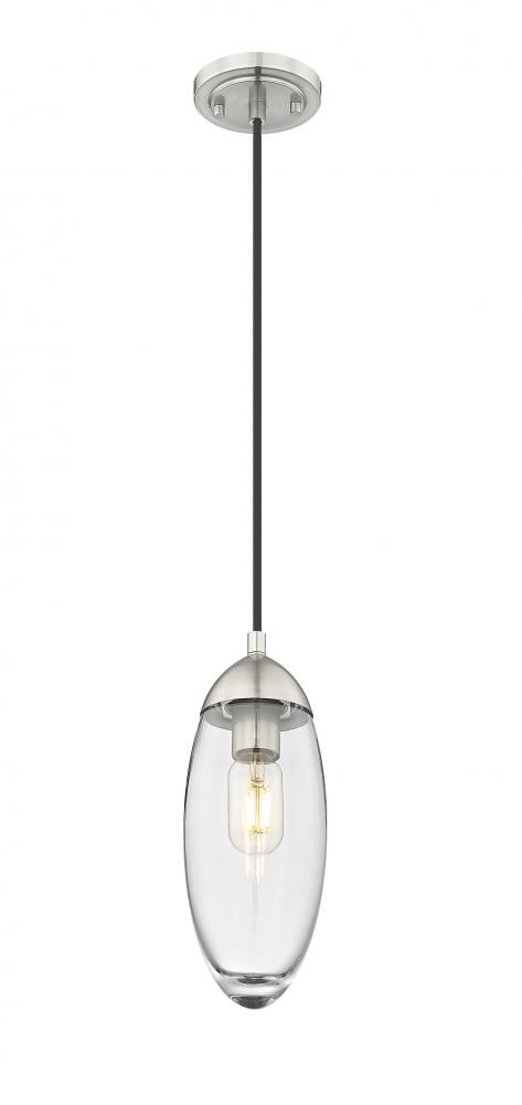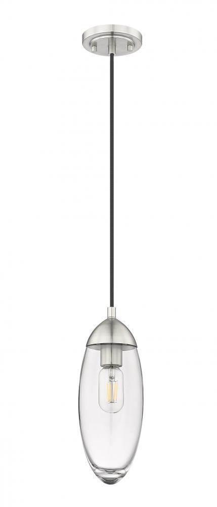 From the Arden collection comes a work of art masquerading as lighting d?cor and adding an ultra-chic glam look with linear principles. This one-light pendant is fashioned for bridging old and new, featuring a linear down rod and canopy in brushed nickel iron. A romantic elliptical glass shade completes its delightful silhouette and provides versatility for complementing any d?cor scheme.