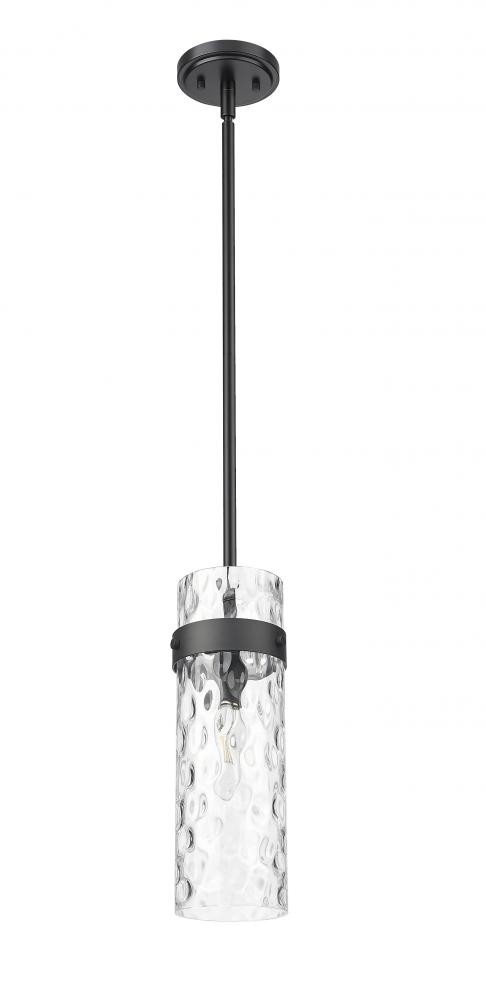 Chic matte black sets the tone for this modern one-light pendant. Perfect alone or in series to create a larger lighting installation, it sparkles with a clear, rippling water glass shade that sets an opulent ambiance. Its black collar and copy are joined with matte black rods, creating a touch of texture and spectacular contrast.