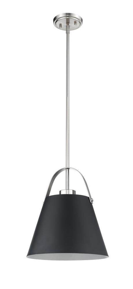 Incorporate design-forward illumination into a decadent contemporary d?cor scheme with this gorgeous one-light pendant. Bring targeted lighting to a dining or living area with a sleek fixture fashioned from Matte Black and Brushed Nickel metal, with a classic angled shade.