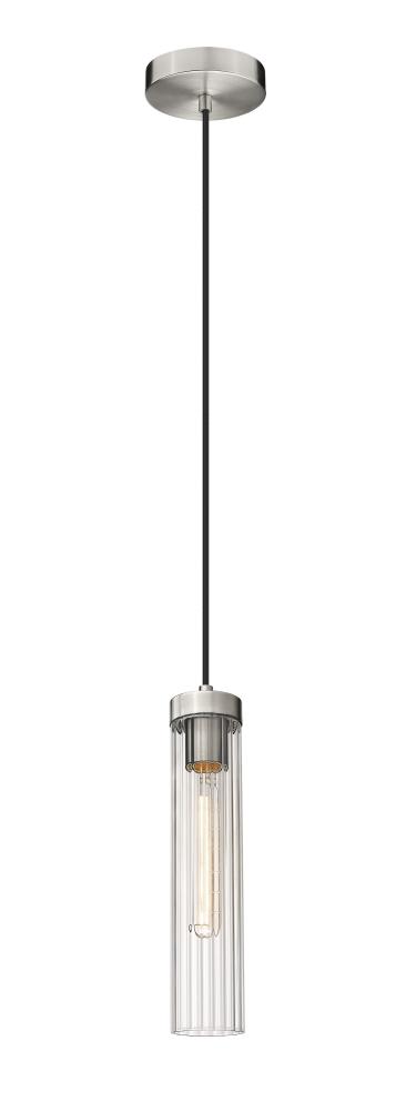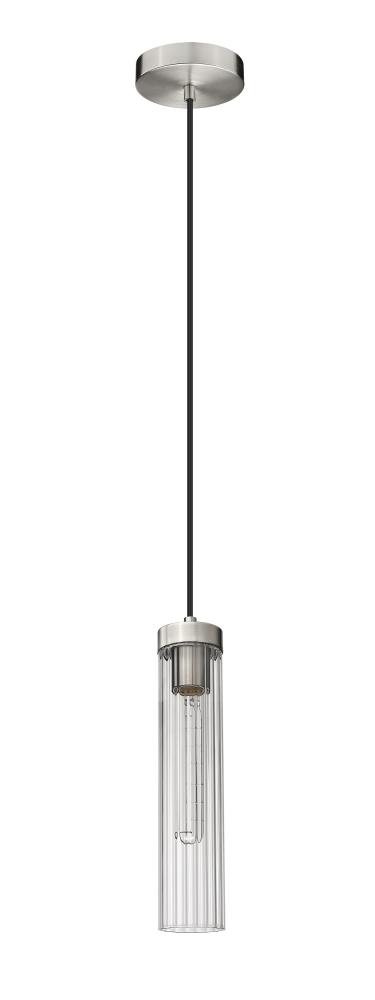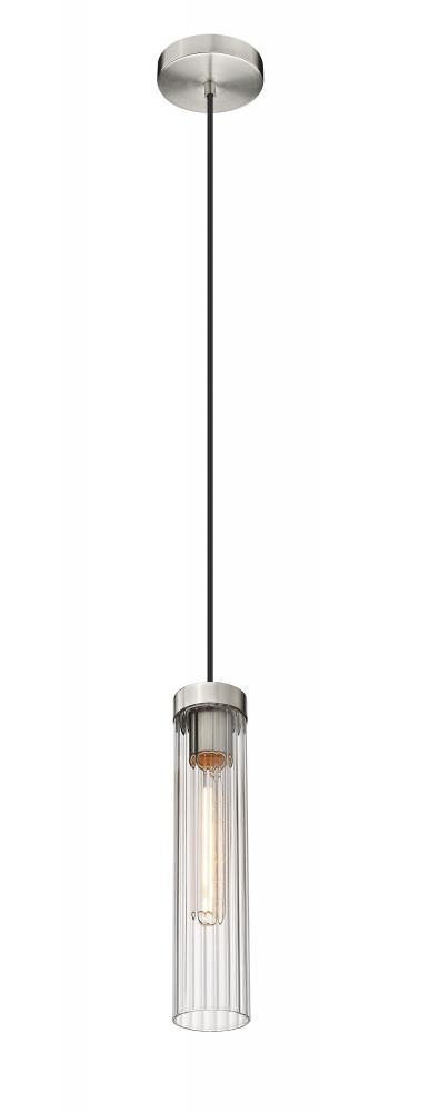Slim, fluted glass create soft light diffusion for a Beau collection one-light pendant. Modern with a timeless sensibility, the pendant shows off a clean, precise silhouette complete with a black cloth suspension and brushed nickel hardware and ceiling plate for a gleaming finishing touch.