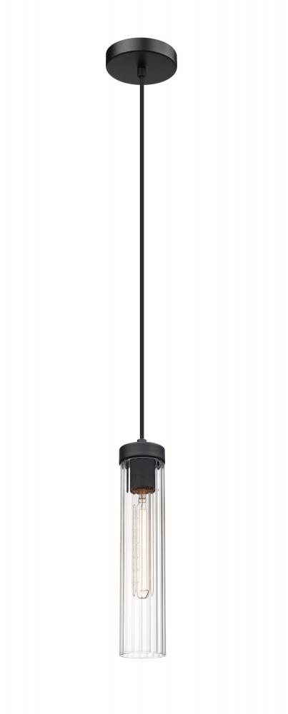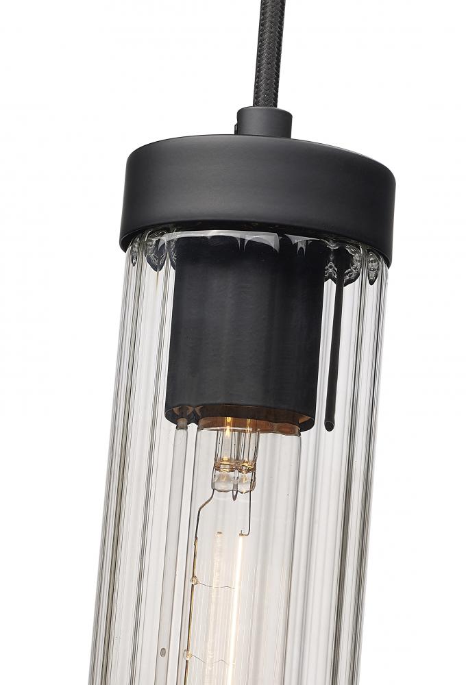 Slim, fluted glass create soft light diffusion for a Beau collection one-light pendant. Modern with a timeless sensibility, the pendant shows off a clean, precise silhouette complete with a black cloth suspension and matching matte black hardware and ceiling plate for a monochromatic finishing touch.