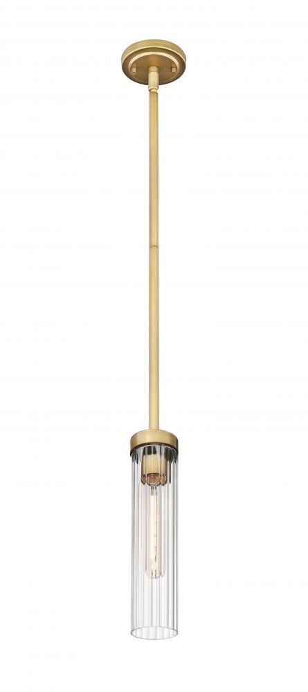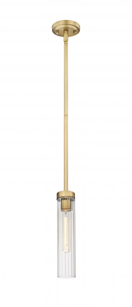Warm, inviting style and finish effects add a sophisticated yet seamless look with a light fixture created to impress. This one-light pendant delivers a streamlined silhouette blending rubbed brass finish steel framing and accents with a charming clear glass cylinder shade, creating a vertical optical division. Choose this stylish pendant for illuminating a nook, living area, or foyer.