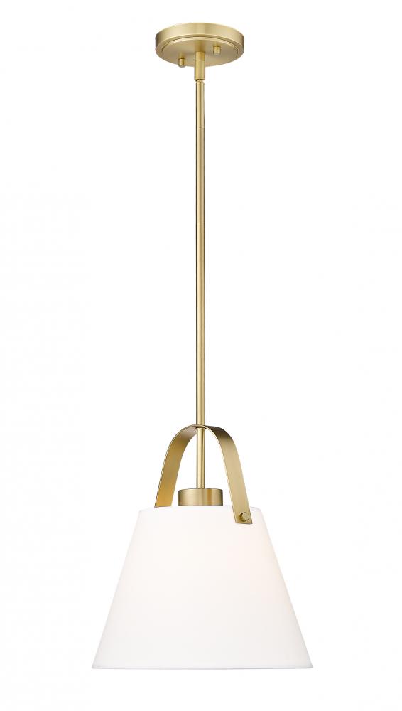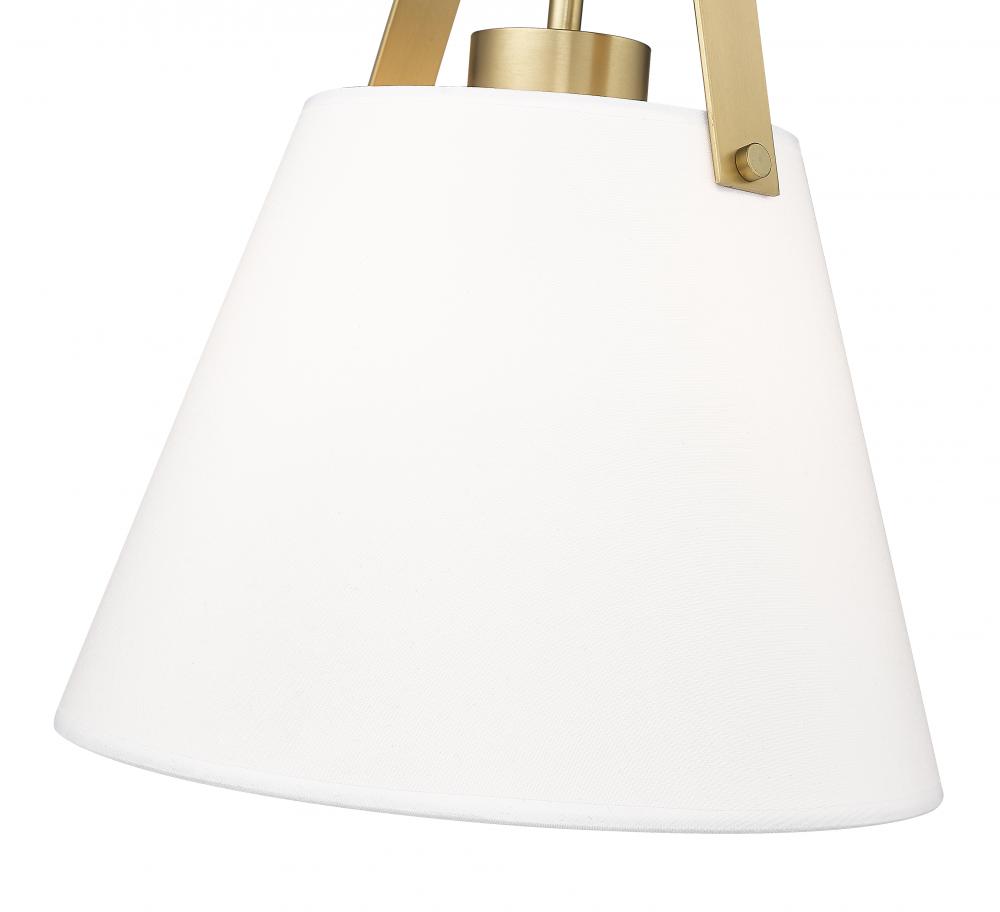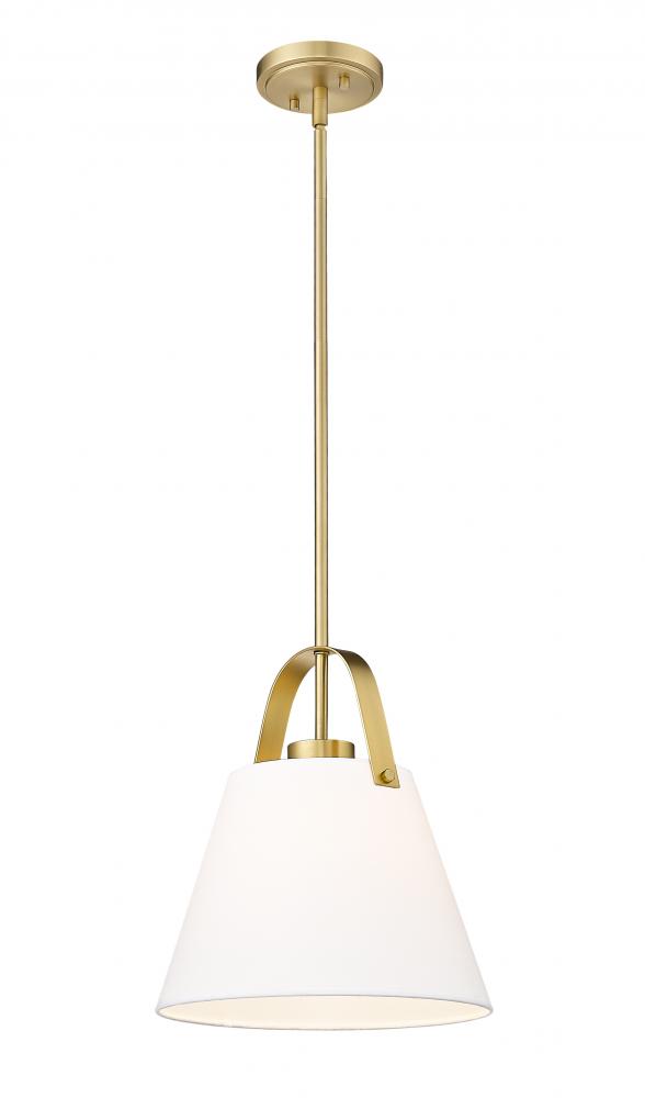 Lush heritage brass metal framing offers a warming effect and elegant style that resonates in a contemporary space. From the Z-Studio collection comes a one-light pendant fashioned of metal hosting a soft ivory fabric conical shade. Embrace optically pleasing silhouetting in a light fixture infusing omni-directional accent lighting that changes the feel of a nook or dining space.