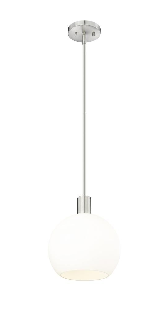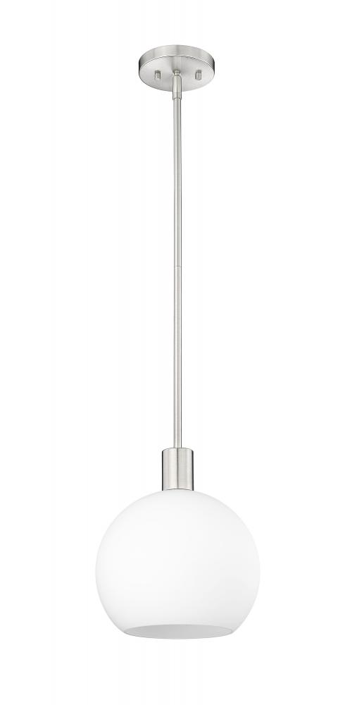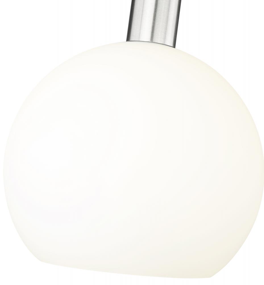 Mid-Century Modern influences make way for this stunningly sleek contemporary pendant, designed with a gorgeous white glass globe shade that brightens interiors elegantly and effortlessly. The glowing orb-like pendant dangles over kitchen islands, countertops and breakfast nook tables, suspended by a slender brushed nickel steel rod and matching flush plate mount. Create a row of these transitional one-light pendants for a more minimalist aesthetic and vintage expression.