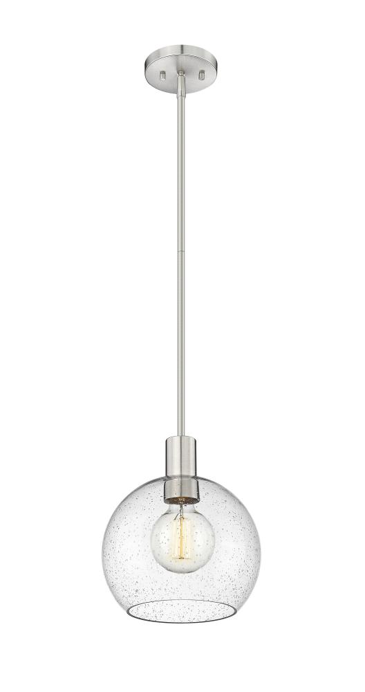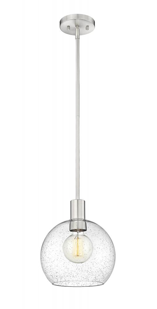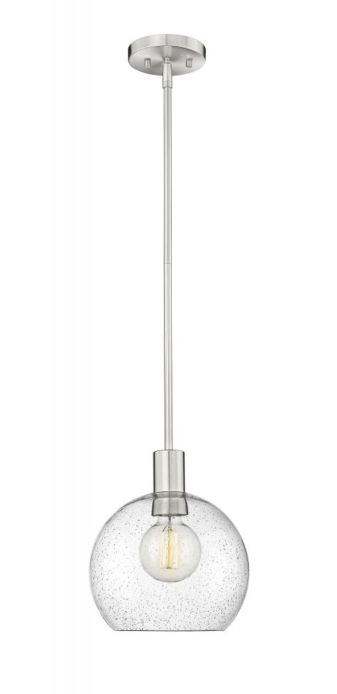 A handmade-inspired artisan quality presents itself in the clear seedy glass globe of this Mid-Century Modern light pendant. Creating a gorgeous illumination across spacious kitchen islands and gathering spaces, this welcoming, classically designed single light pendant also offers a luxe metallic touch with its brushed steel suspension rod and round disc-shaped plate mount. The orb-like globe, with its Arts and Crafts era seedy glass design, also gives off a subtle texture and scintillation across tablescapes.