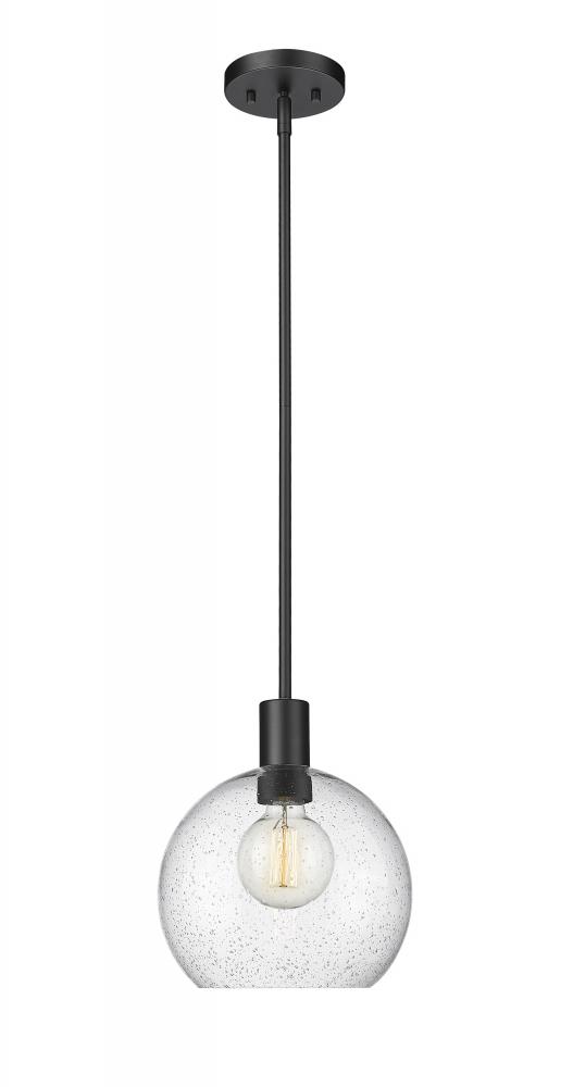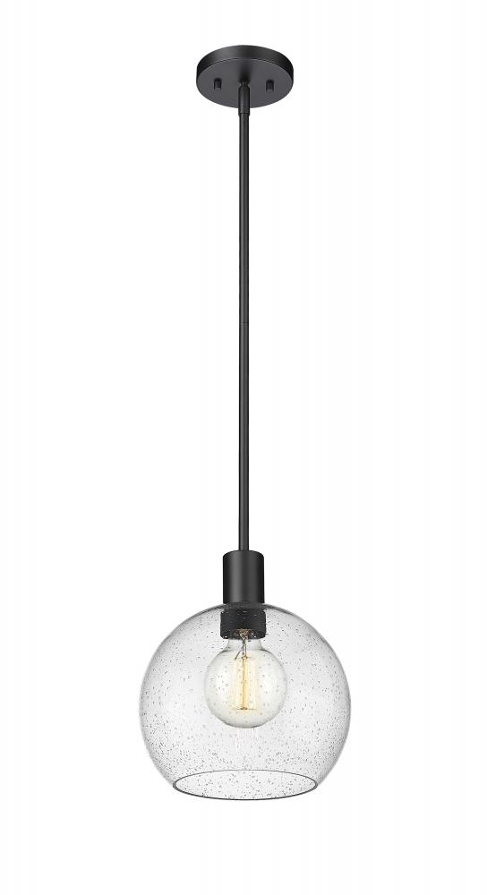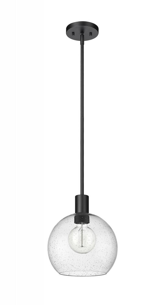 A handmade-inspired artisan quality presents itself in the clear seedy glass globe of this Mid-Century Modern light pendant. Creating a gorgeous illumination across spacious kitchen islands and gathering spaces, this welcoming, classically designed single light pendant also offers a luxe metallic touch with its dramatic matte black steel suspension rod and round disc-shaped plate mount. The orb-like globe, with its Arts and Crafts era seedy glass design, also gives off a subtle texture and scintillation across tablescapes.