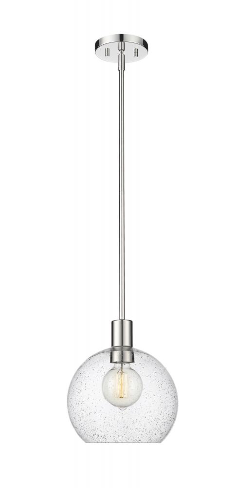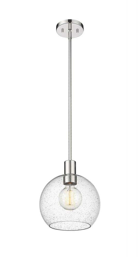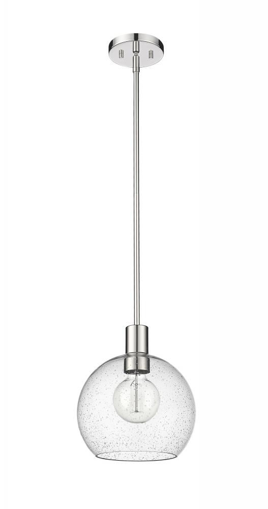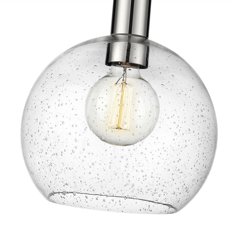 A handmade-inspired artisan quality presents itself in the clear seedy glass globe of this Mid-Century Modern light pendant. Creating a gorgeous illumination across spacious kitchen islands and gathering spaces, this welcoming, classically designed single light pendant also offers a luxe metallic touch with its lustrous and shiny polished nickel finish steel suspension rod and round disc-shaped plate mount. The orb-like globe, with its Arts and Crafts era seedy glass design, also gives off a subtle texture and scintillation across tablescapes.