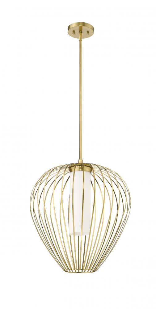 Slender spokes curve and taper to create the bulbous profile of a modern one-light pendant. Striking over a kitchen island or in your living room, it boasts a warm modern gold finish paired with a white opal glass inner diffuser, creating inviting, true illumination and wonderful ambiance.