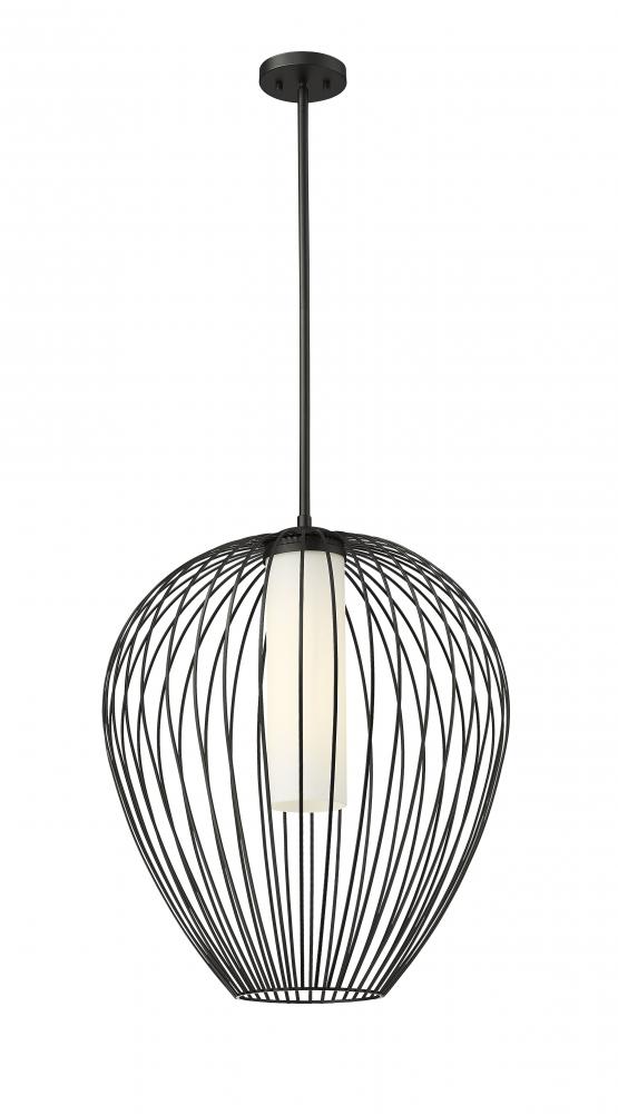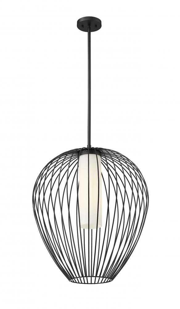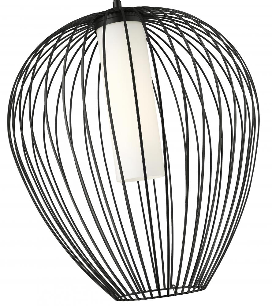 An inner shade of white opal glass create inviting illumination for a modern one-light pendant with big personality. Its outer cage frame features slender spokes that curve and taper to create a rounded silhouette, adding bold style over an island, or living room. The fixture features a rich matte black finish to set a refined but casual ambiance.