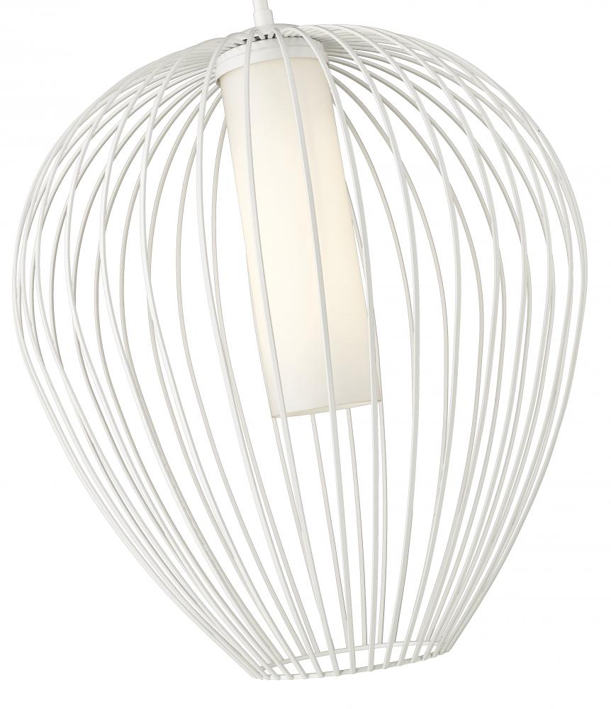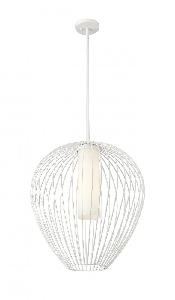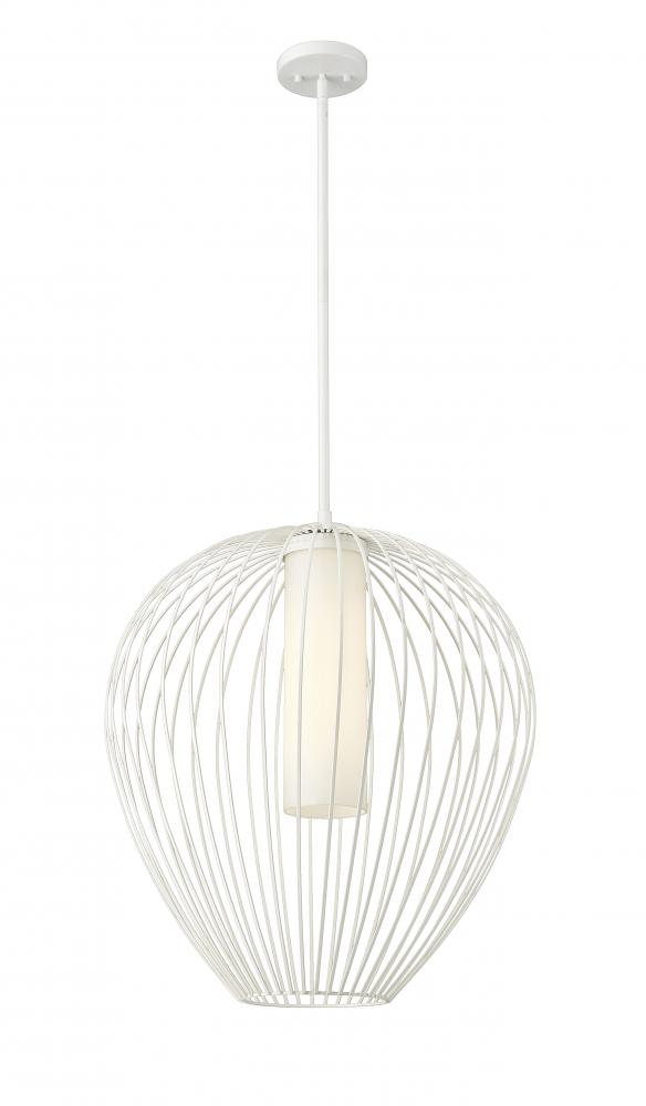 An inner shade of white opal glass create inviting illumination for a modern one-light pendant with big personality. Its outer cage frame features slender spokes that curve and taper to create a rounded silhouette, adding bold style over an island, or living room. The fixture features a cool textured white finish to set a refined but casual ambiance.