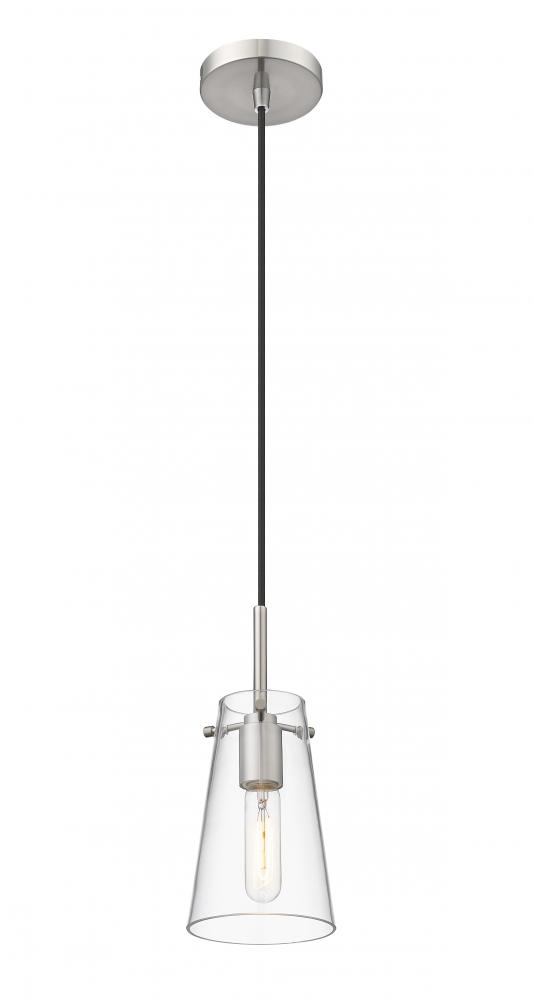 Clear glass defines a slim silhouette, bringing refined style to a modern one-light pendant. Its sleek brushed nickel finish sets the tone for a refined living space, kitchen or powder room. The gentle tapering cone silhouette of the pendant ensures its timeless look, perfect alone or in series lighting a larger space.
