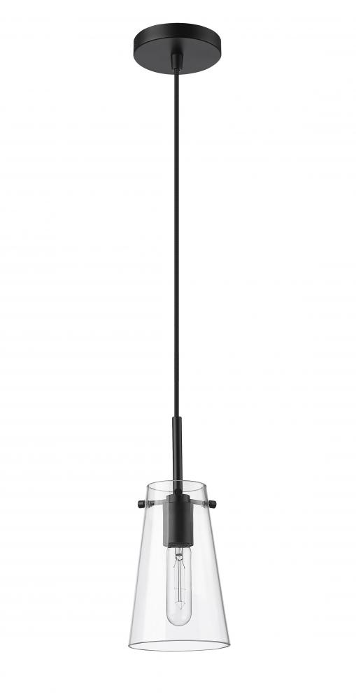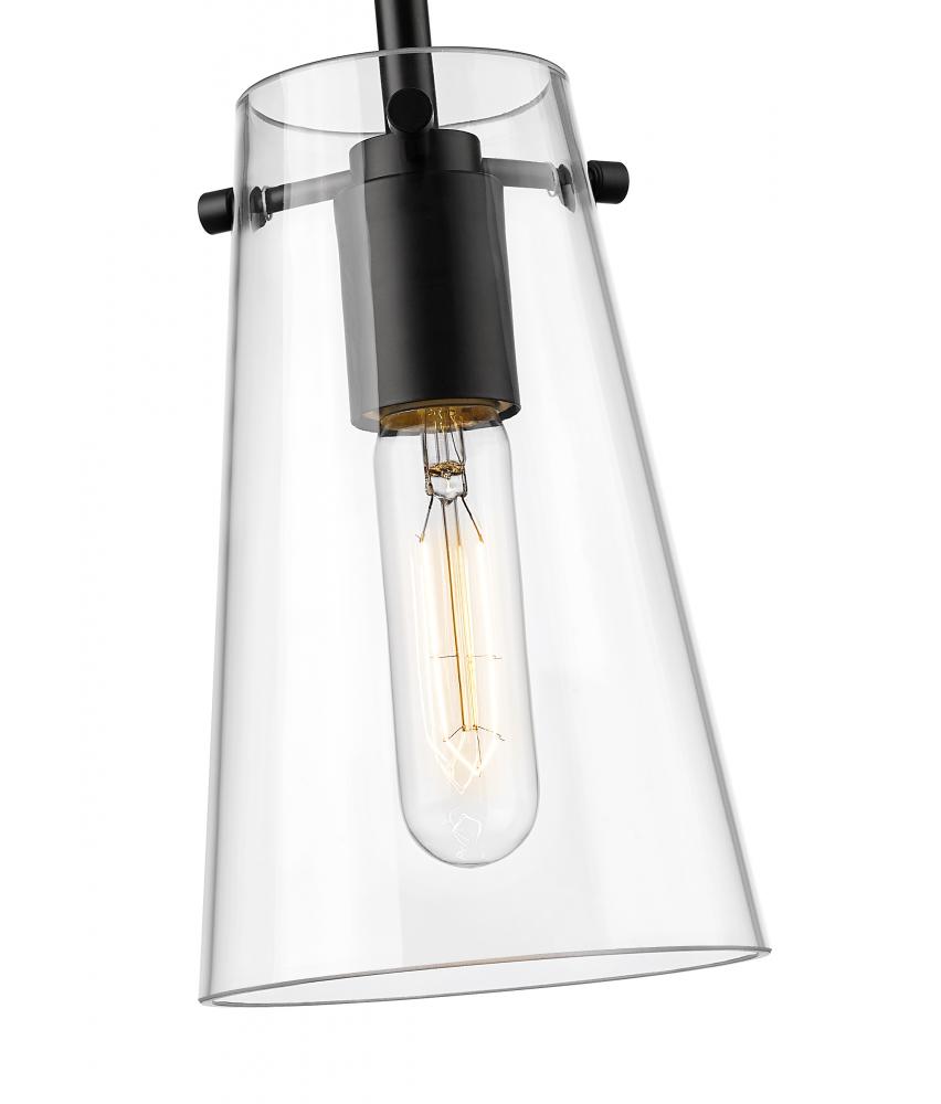 Clear glass defines a slim silhouette, bringing refined style to a modern one-light pendant. Its stately matte black finish sets the tone for a refined living space, kitchen or powder room. The gentle tapering cone silhouette of the pendant ensures its timeless look, perfect alone or in series lighting a larger space.