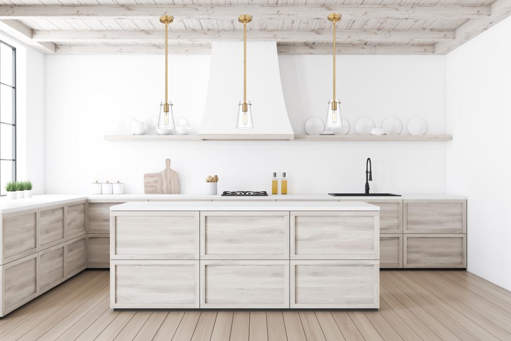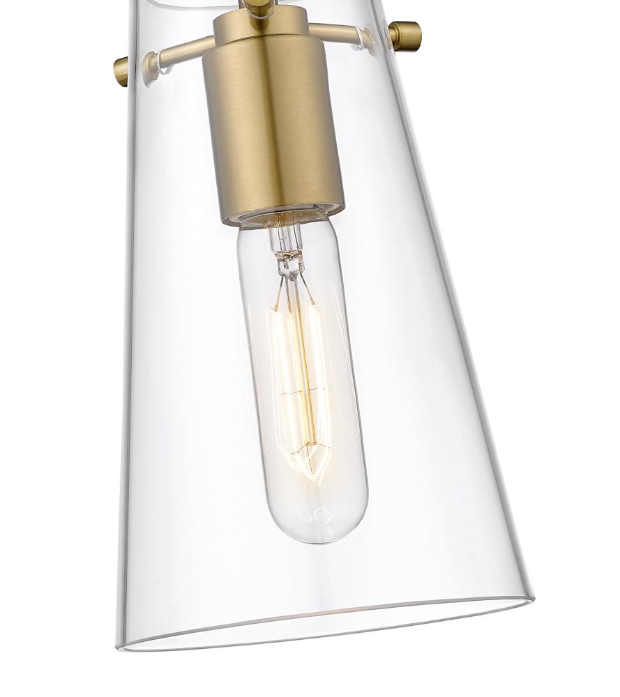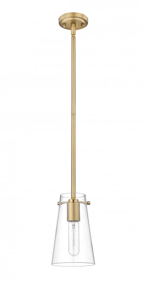 Infused with modern appeal, this one-light pendant pairs a rich modern gold finish with a minimalist silhouette that clears the way for beautiful illumination. A conical shade of clear glass refracts light for bright lighting over a kitchen island or in your living area. Its simplicity is a highlight, perfect for a contemporary space that embraces understated refinement.