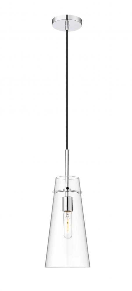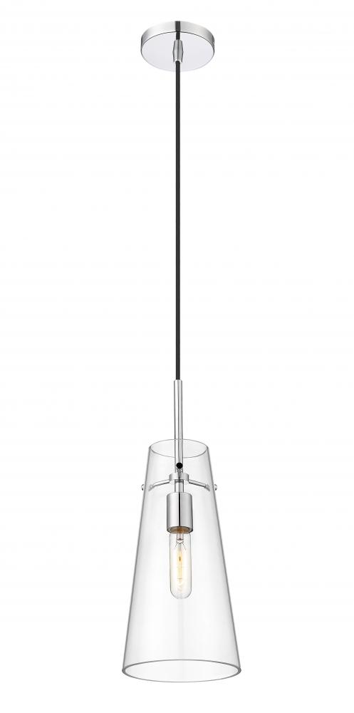 An elongated cone of clear glass sets the tone for a modern one-light pendant. Infused with minimalist elegance, it showcases a simple, sleek housing and suspension for a crisp, clean look and feel in your kitchen, living room or powder room. A gleaming chrome finish is crisp and timeless, setting the tone for surrounding decor.