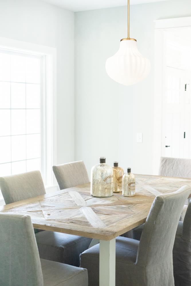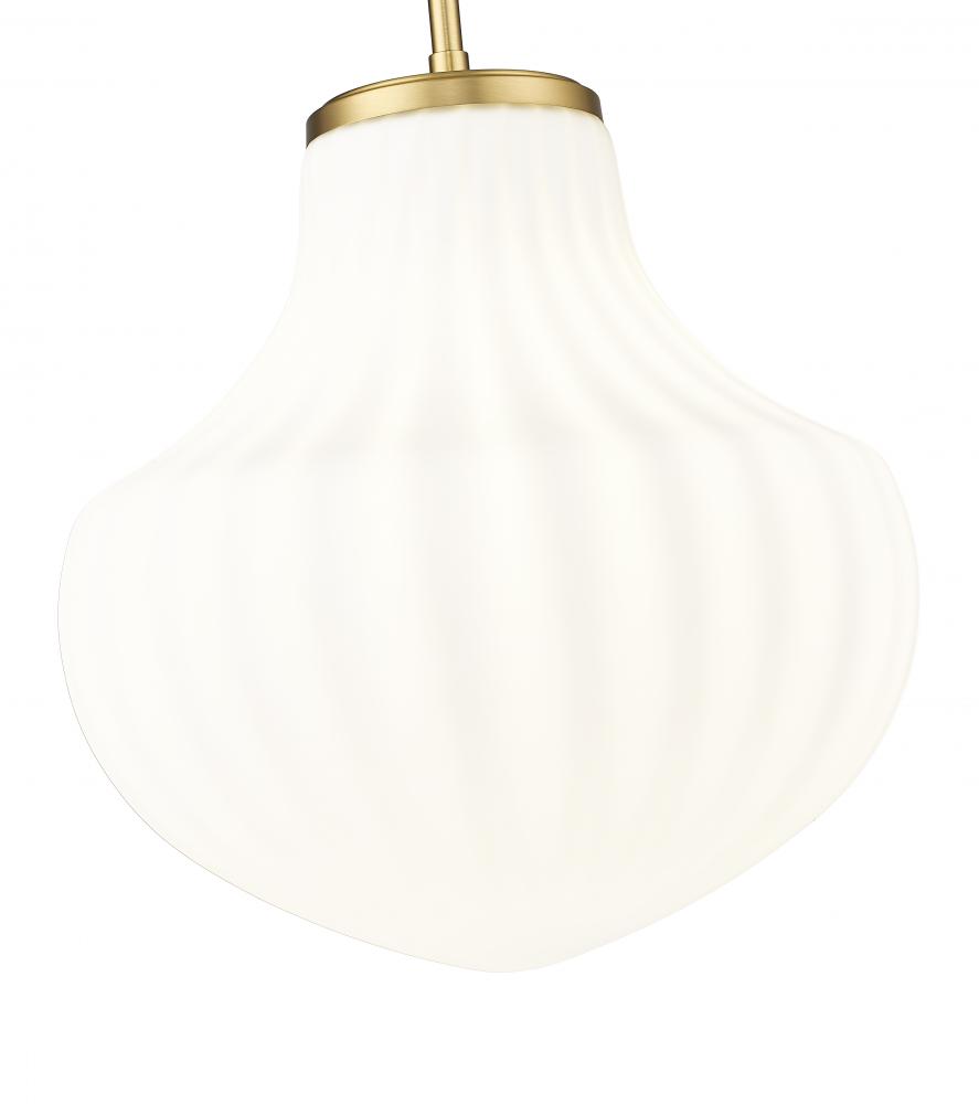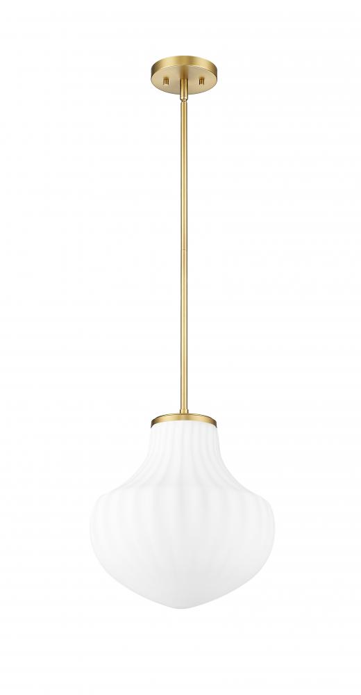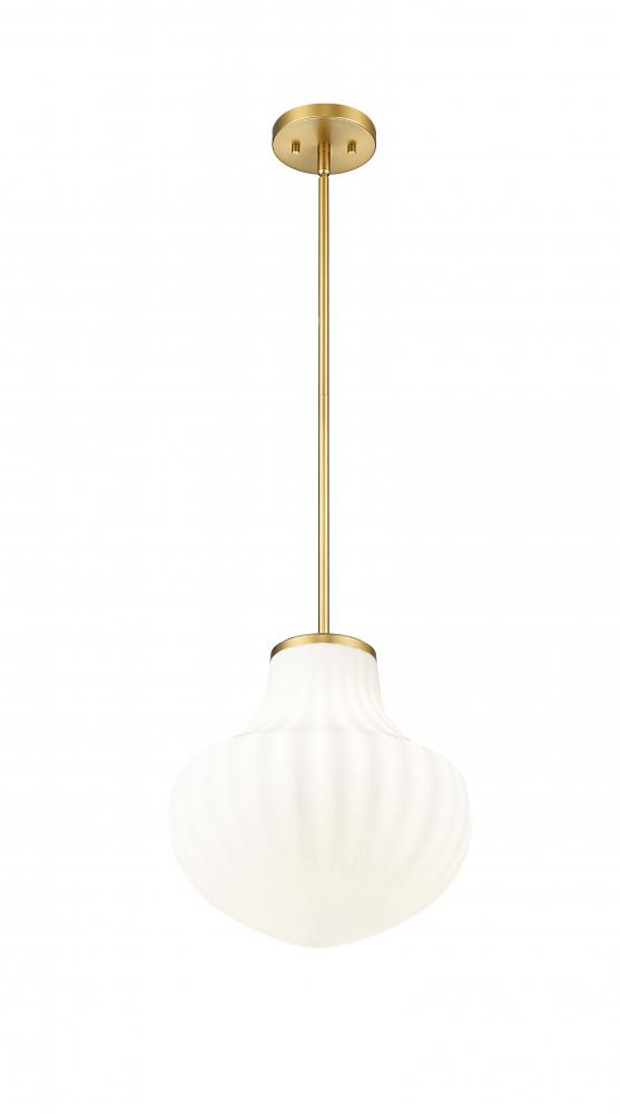 Put a fresh spin on bedroom or den lighting with the generous size of a modern one-light pendant. Its updated schoolhouse persona embraces texture, showcasing delicate ribbed glass and a modern gold finish that infuses richness and sophistication.