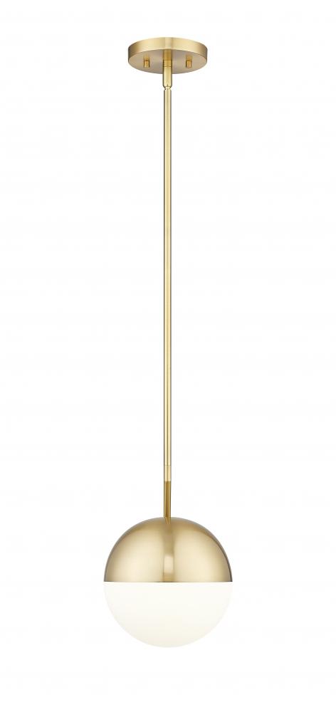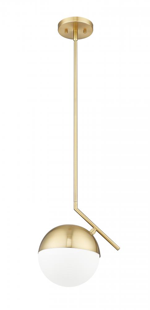 A distinctive silhouette is created with the angular arm featured on this mid-century modern one-light pendant. Perfect alone or in series to create a larger installation, it boasts a rich modern gold finish that imparts impeccable warmth and inviting ambiance. Its orb shade adds smooth curves, complete with a metal shield and opal glass for excellent illumination.