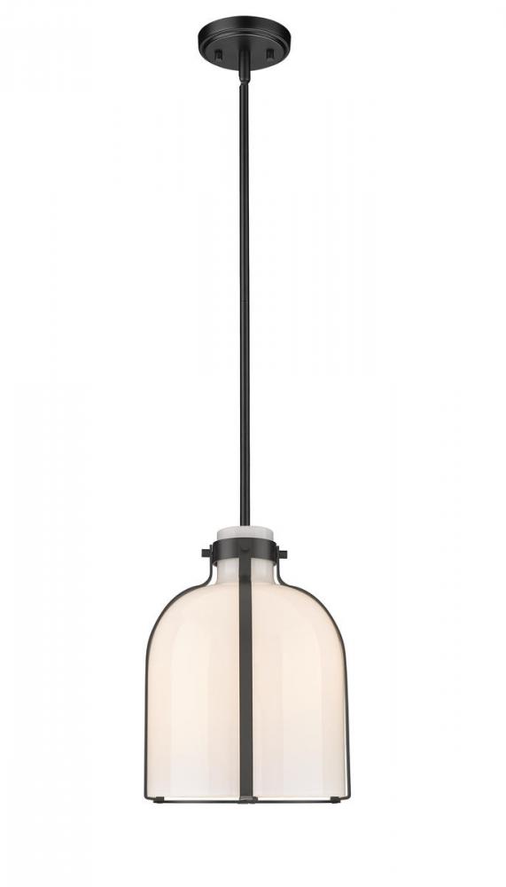 This one-light chandelier will invite modern farmhouse appeal to your dining room, kitchen island, or breakfast bar. It features a steel construction with a matte black finish and a white opal glass shade to diffuse the light. The crisp and clean design of this chandelier makes it a focal point in your space.