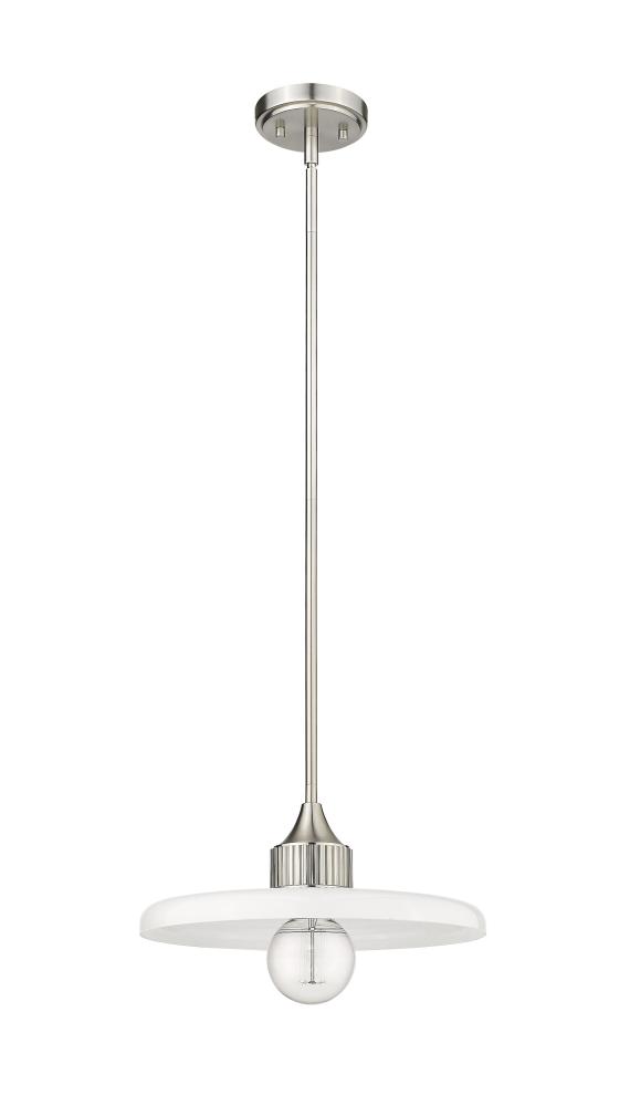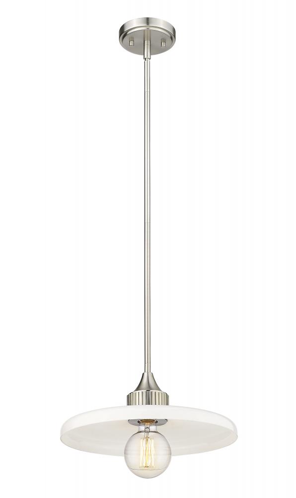A disc of smooth, glossy opal glass diffuses the illumination from this modern one-light pendant. Dramatic in any room, the fixture pairs a sleek brushed nickel finish with a simple, clean silhouette that promises bright illumination in a stylish but understated profile.