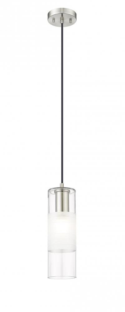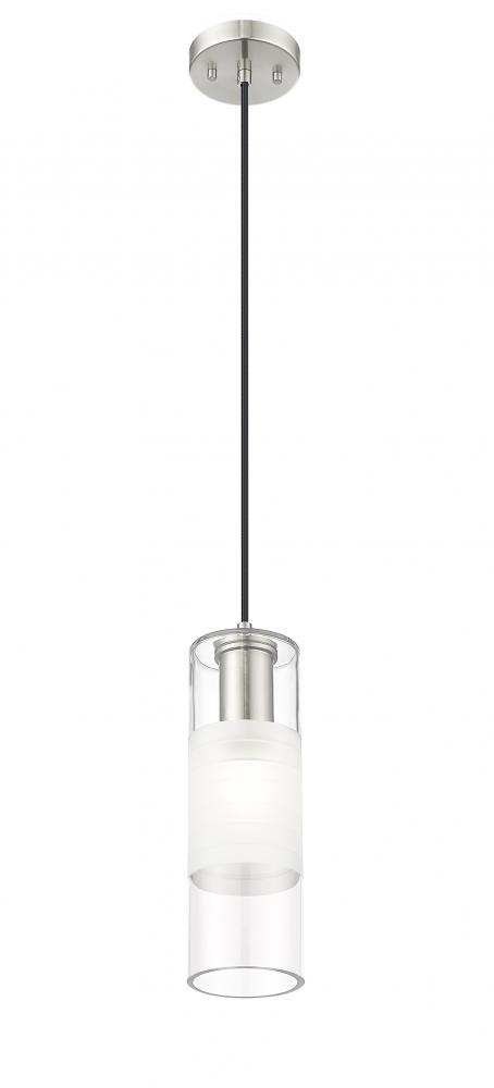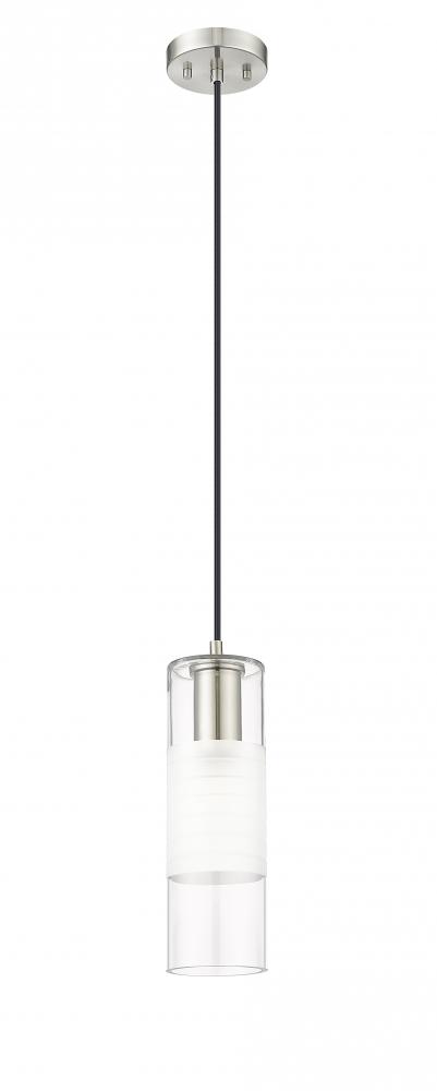 A chic cylinder of artisan glass, with frosted and clear elements that create exceptional style, establishes the silhouette of a modern one-light pendant. Designed for the Alton collection, it showcases a robust housing and a round canopy, both in a cool brushed nickel finish over steel construction. A braided cloth cord cover completes the look with the perfect hint of texture and tailoring.