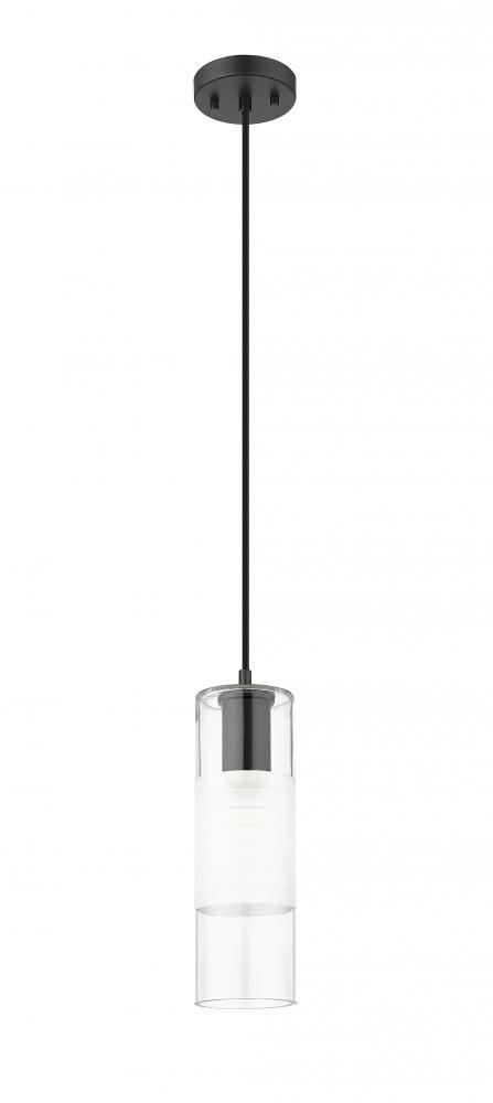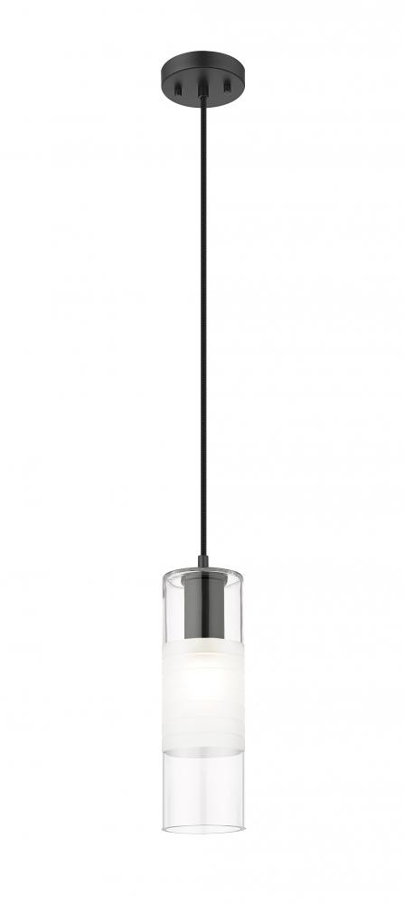 A chic cylinder of artisan glass, with frosted and clear elements that create exceptional style, establishes the silhouette of a modern one-light pendant. Designed for the Alton collection, it showcases a robust housing and a round canopy, both in a cool matte black finish over steel construction. A braided cloth cord cover completes the look with the perfect hint of texture and tailoring.