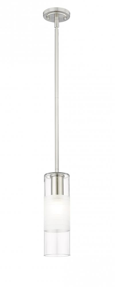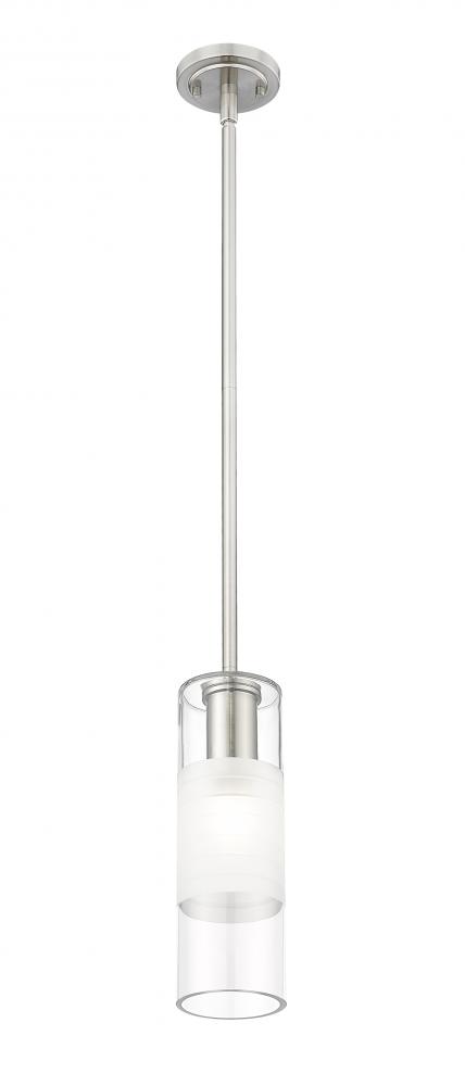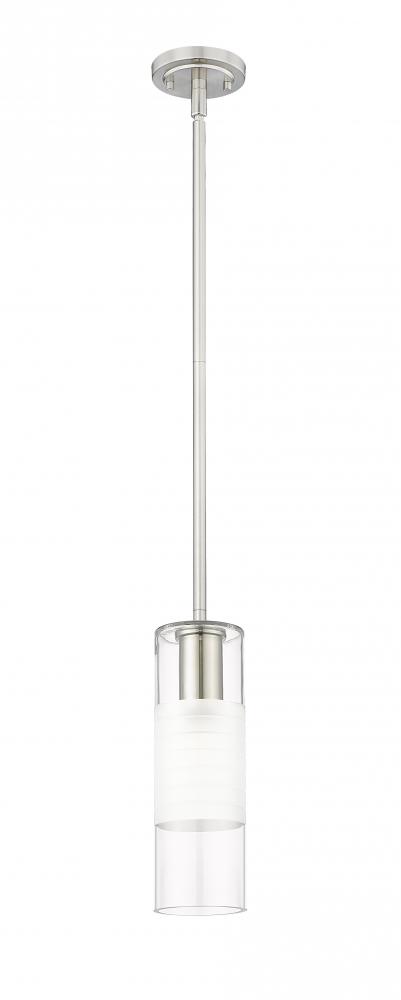 Artisan glass, arranged in a chic cylinder with frosted and clear elements, defines a modern one-light pendant. Designed for the Alton collection, it pairs a round canopy and robust housing, both in a cool brushed nickel finish over steel construction. Completing the look with a touch of texture is a braided cloth cord cover instills a tailored finishing touch.