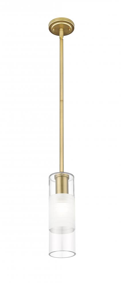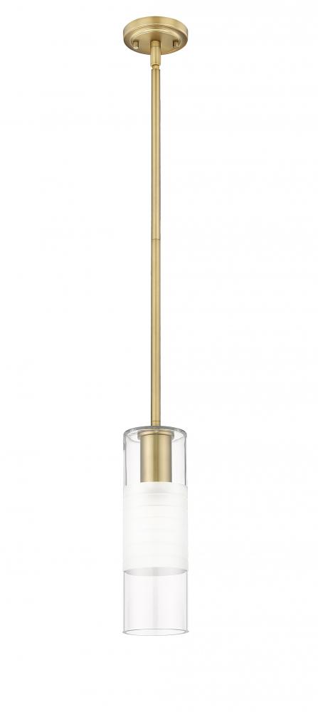 Artisan glass, arranged in a chic cylinder with frosted and clear elements, defines a modern one-light pendant. Designed for the Alton collection, it pairs a round canopy and robust housing, both in a rich modern gold finish over steel construction. Completing the look with a touch of texture is a braided cloth cord cover instills a tailored finishing touch.