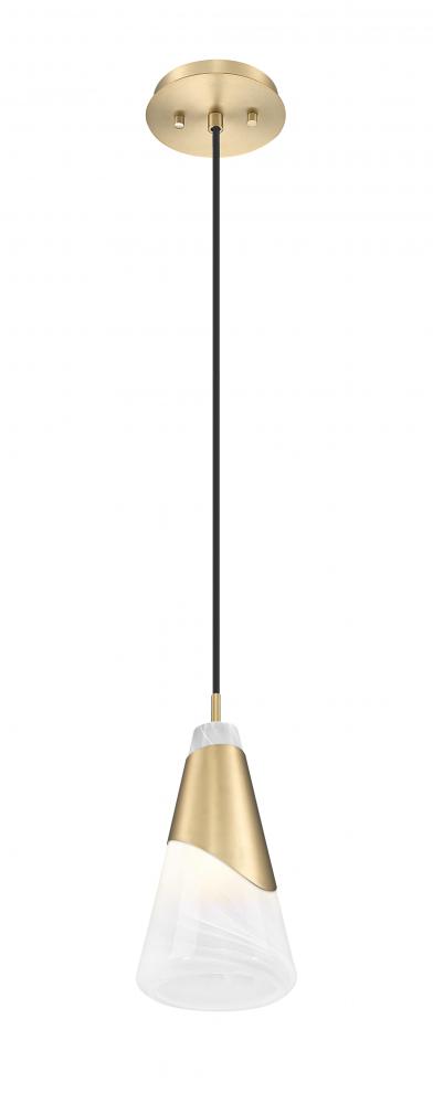 Emphasize elegant simplicity and warmth with this modern pendant design. Showcasing a curvy metal shroud over a cone of swirling artisan glass, its a compelling sight alone or in series to create a larger lighting installation. Its modern gold finish is a true highlight in your kitchen, bath or living area.