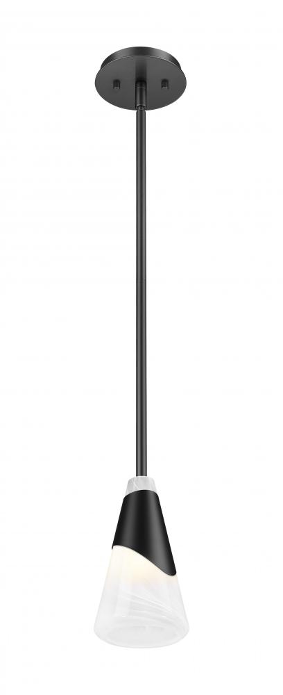 The richness of a matte black finish maximizes contrast and depth on this modern pendant light. Complete with a steel canopy and downrod, the fixture includes a conical shade with a curvy metal shroud that reduces glare and helps to diffuse illumination. Finally, swirled artisan glass adds a touch of dimension and depth for a sophisticated look and feel in any room.