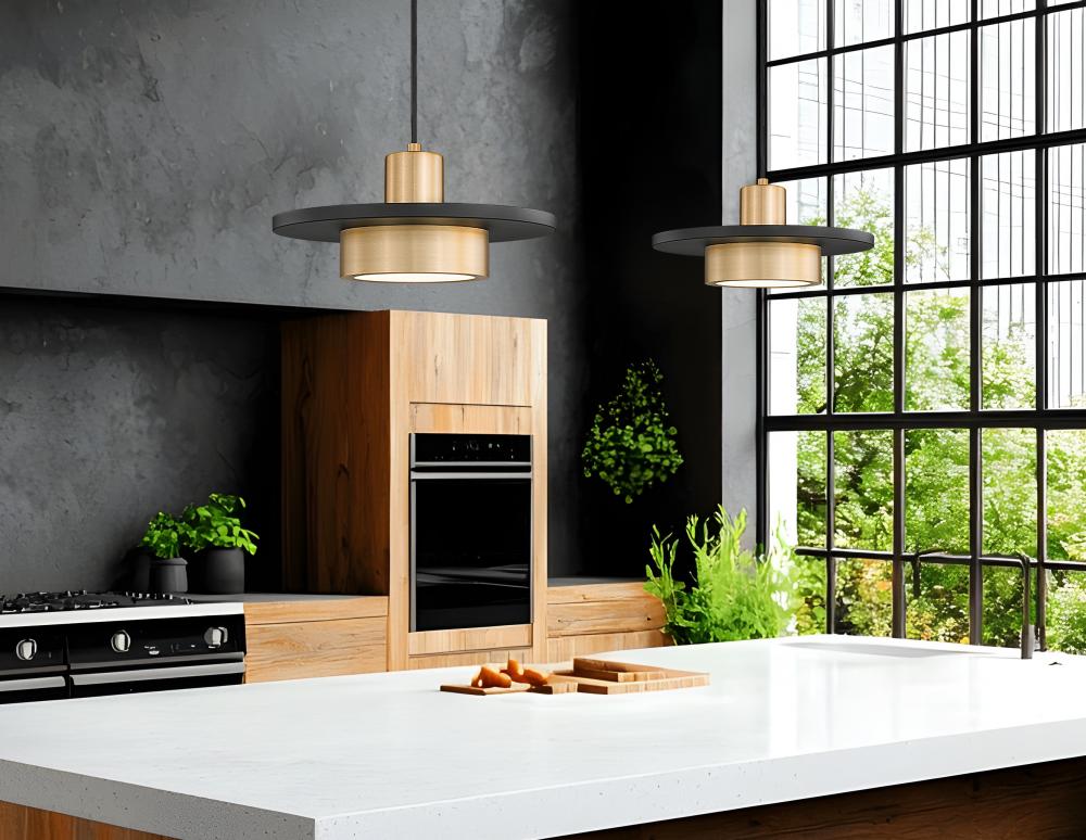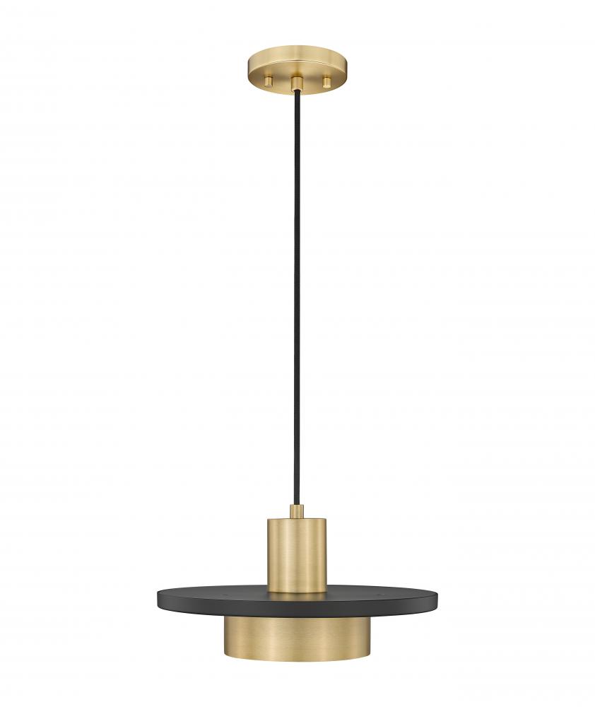 Admire the iconic art deco motif of a simple yet elegant one-light pendant delivering versatility to smaller settings. Modern gold finish steel construction creates cylinder elements sandwiched by a chic matte black disc, with a black cable and gold canopy working in a genius distribution of color. This fixture sends dimmable LED lighting through a frosted acrylic diffuser, creating options for mood lighting.