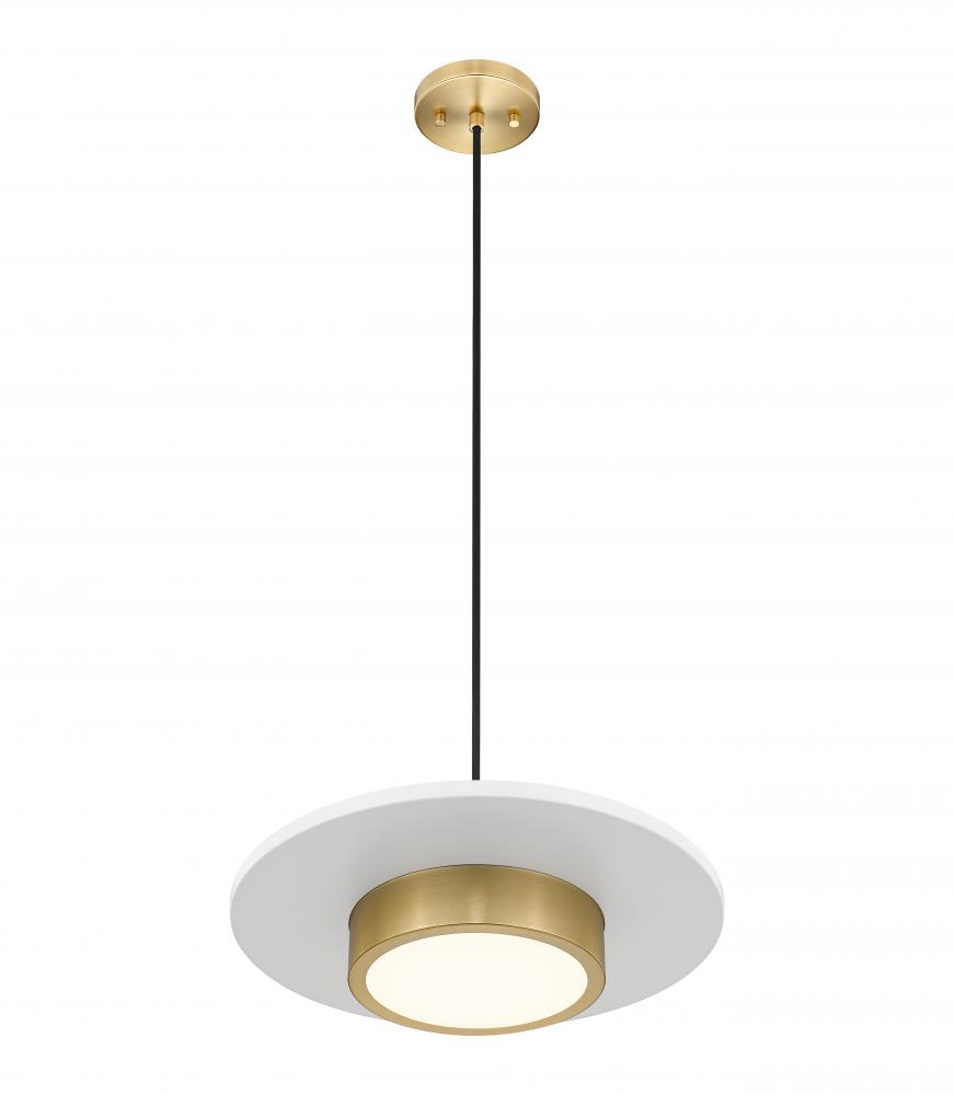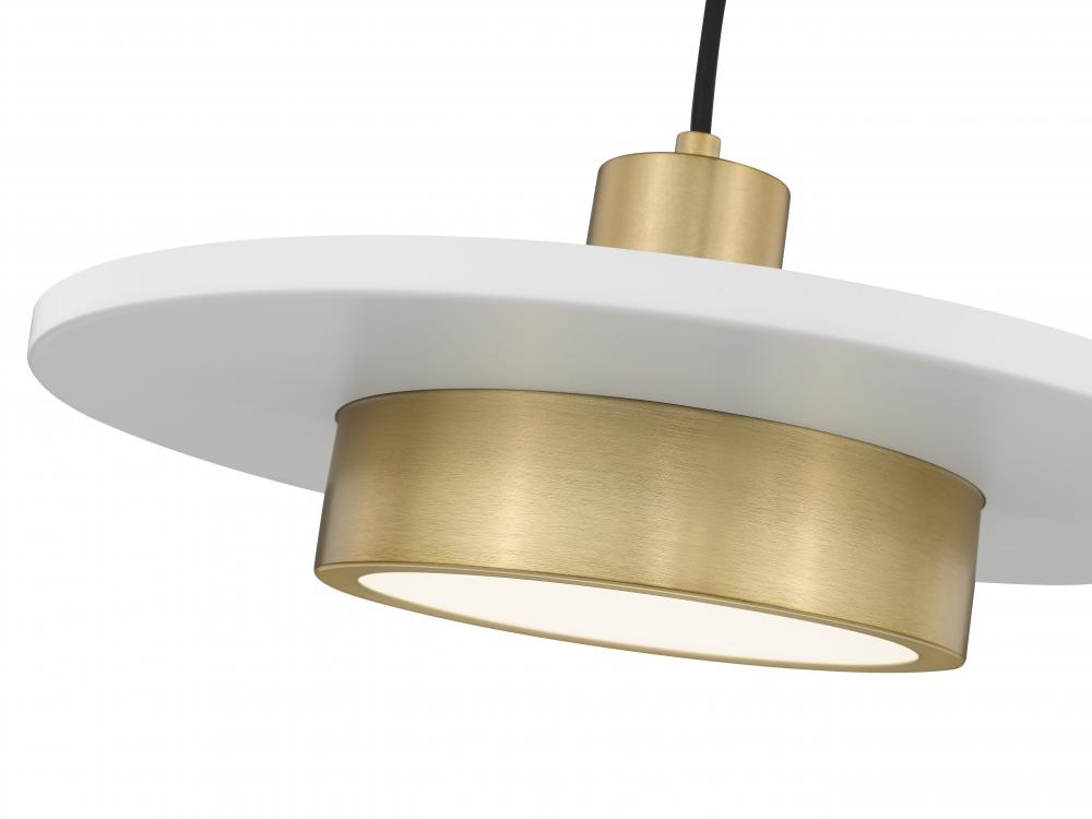 Amazing with a mix of simplicity and iconic retro style, this one-light pendant light makes a difference in living rooms, hallways, and bedrooms. Modern gold finish steel framing combines various sizes of cylinder elements interrupted by a charming matte white disc and suspended with a bold black cord. Dimmable LED lighting shines through a frosted acrylic shade, creating options for varying light levels to suit a range of lighting needs.