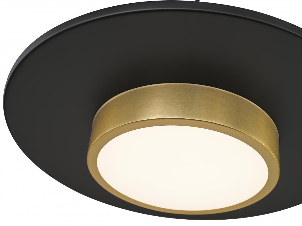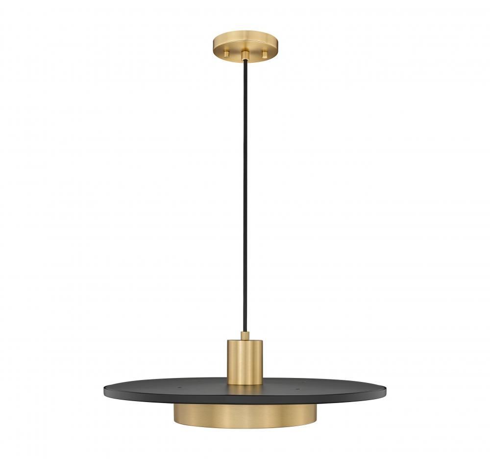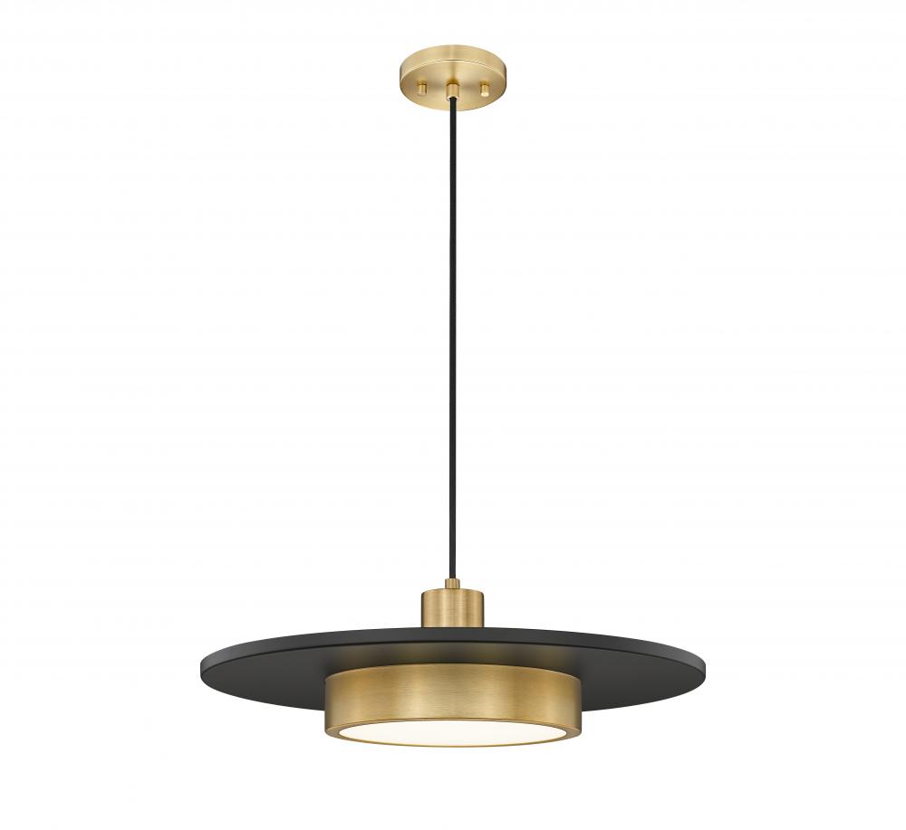Epic, iconic style makes the most of simplicity in a one-light pendant perfect for a host of settings. Geometric shapes include cylinder elements made of modern gold finish steel construction with a centered large matte black disk creating visual separation. LED lighting through a frosted acrylic shade features dimming options to create mood lighting.