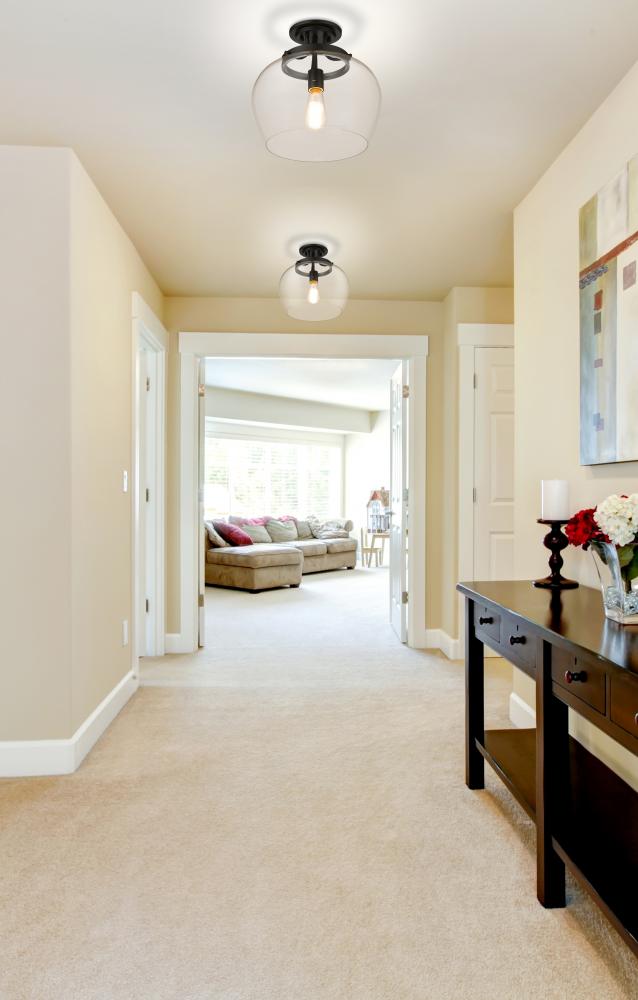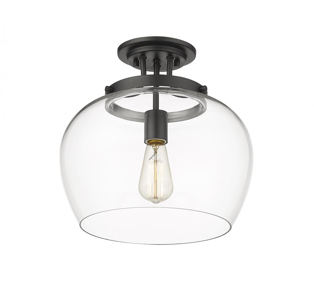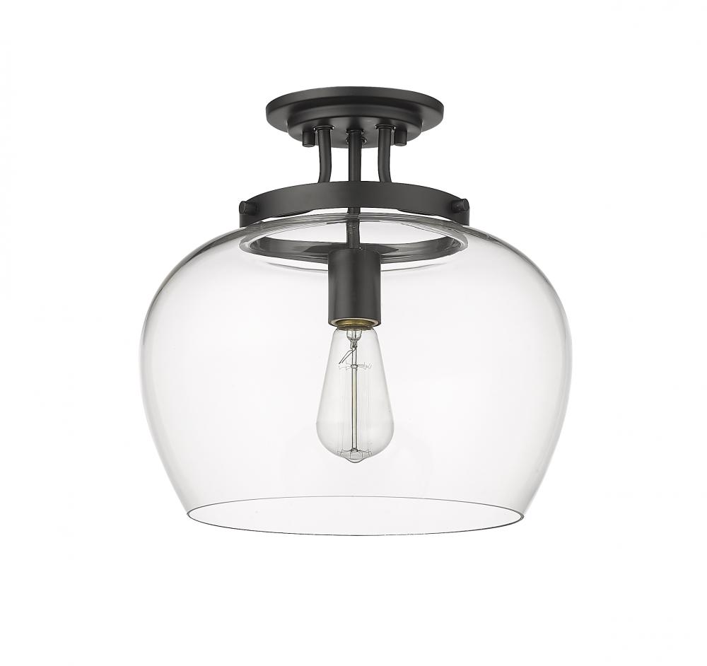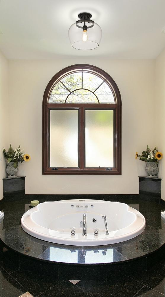 A bold black frame embellishes brilliant glass, forming an exceptional aesthetic in the Joliet semi flush mount ceiling light. Kitchens, hallways, and bedrooms come to life with the shapely silhouette of a large Bordeaux glass shade and an industrial-inspired frame crafted of matte black finish steel.