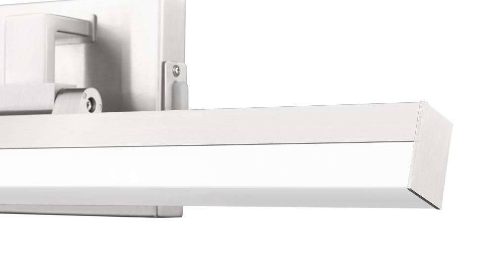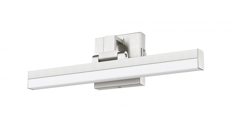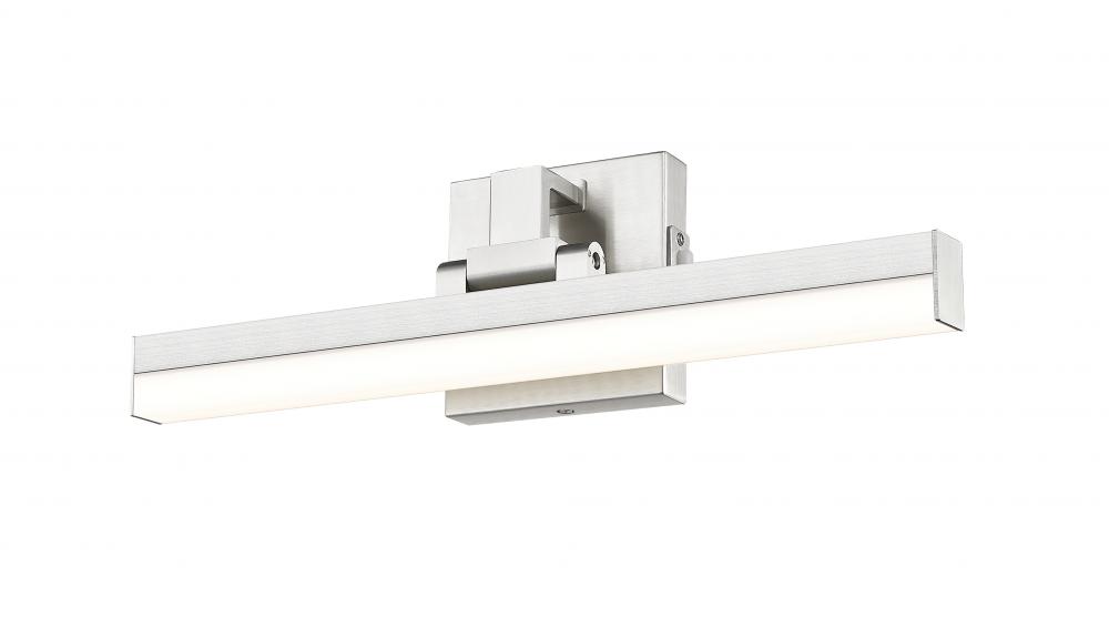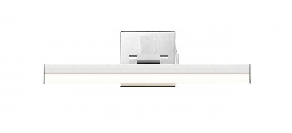 Style a modern or transitional bath space with a one-light vanity light adopting a linear aesthetic. Sculptural elements maintain symmetry and clean lines in a fixture fashioned of brushed nickel finish aluminum with a frosted plastic diffuser, emitting dimmable lighting with options for perfecting the level of ideal white color.