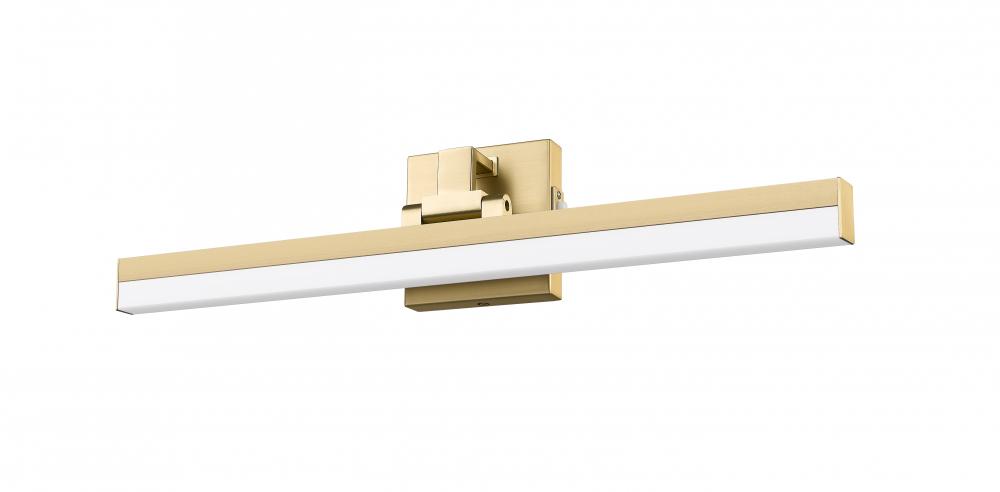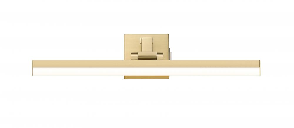 Mix up aesthetics with a design scheme blending crisp modern and transitional industrial with a one-light vanity light that enhances a bath space. Sculptural elements maintain symmetry and clean lines in a fixture with a modern gold finish aluminum frame and a frosted plastic diffuser, emitting dimmable lighting with options for perfecting the level of ideal white color.