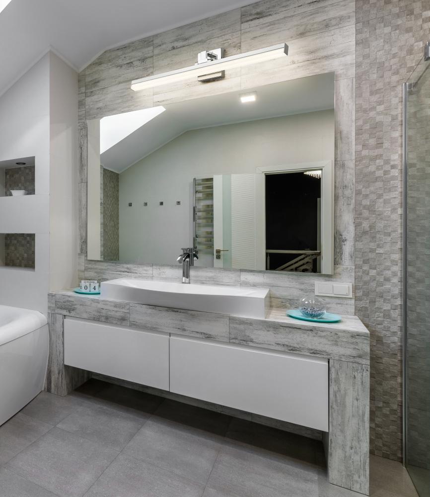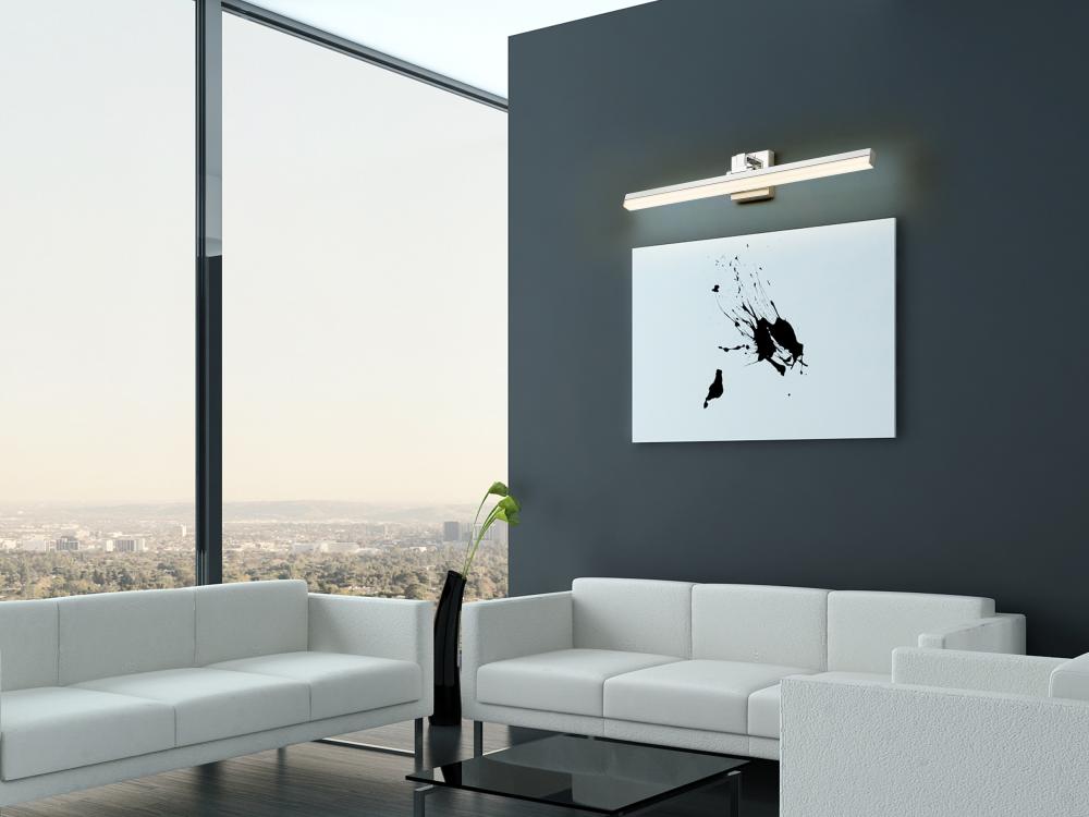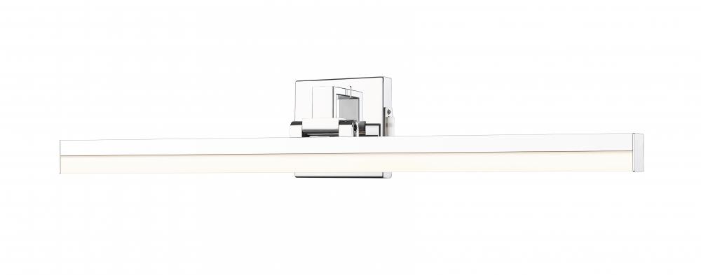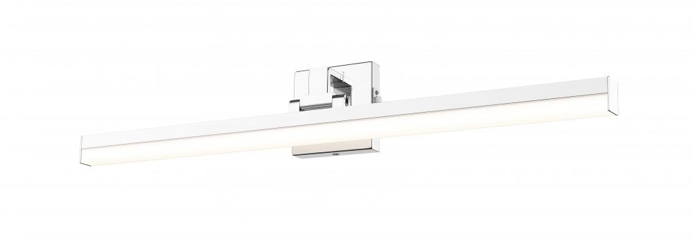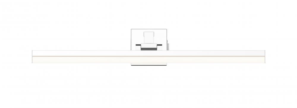 A geometric linear design adds a mix of modern and transitional industrial attitude in this one-light vanity light. Sculptural elements maintain symmetry and clean lines in a fixture with a bright chrome finish aluminum frame and a frosted plastic diffuser, emitting dimmable lighting with options for perfecting the level of ideal white color.