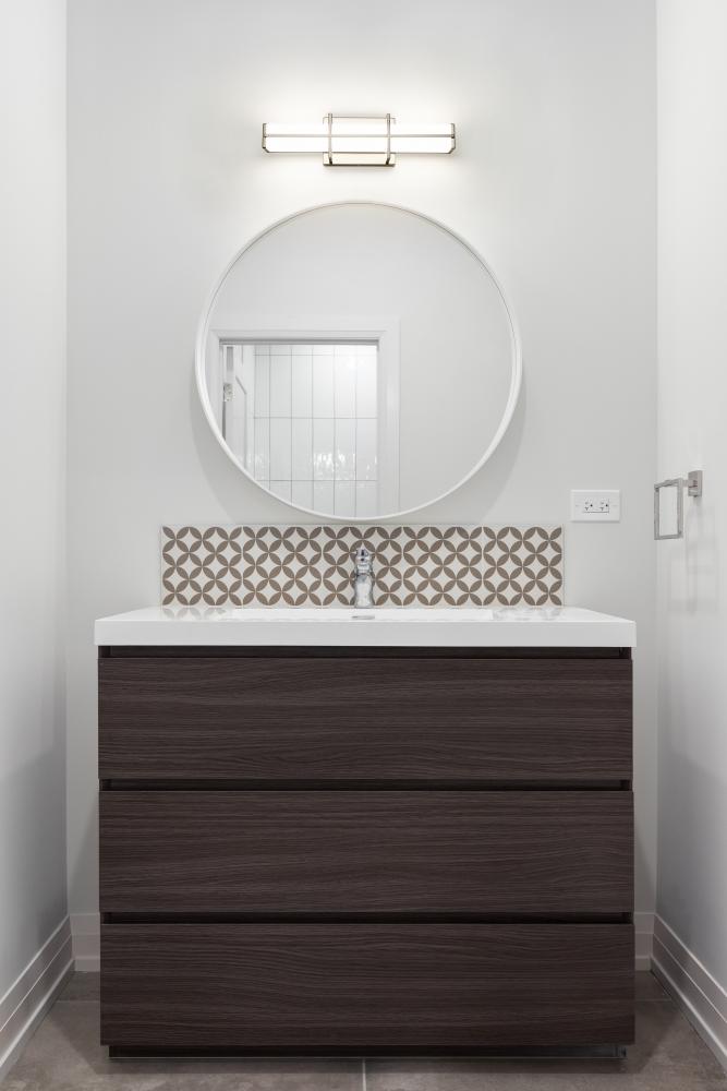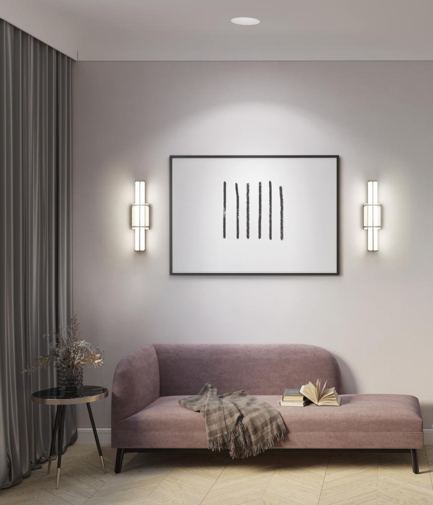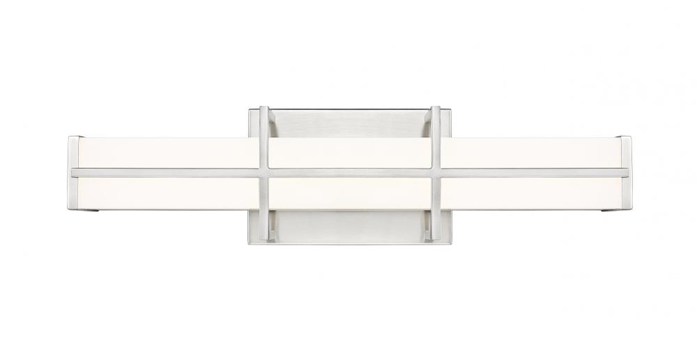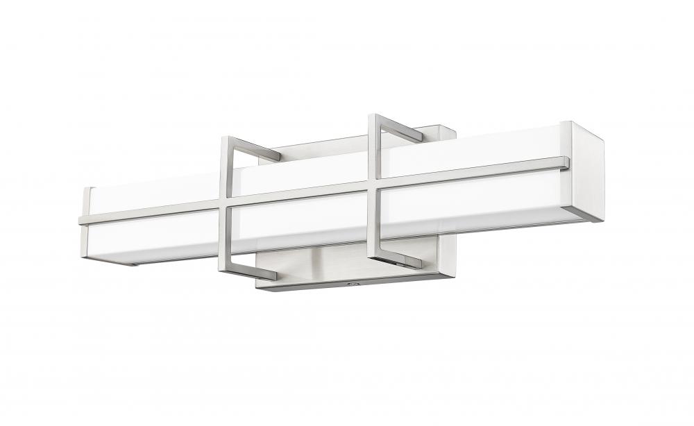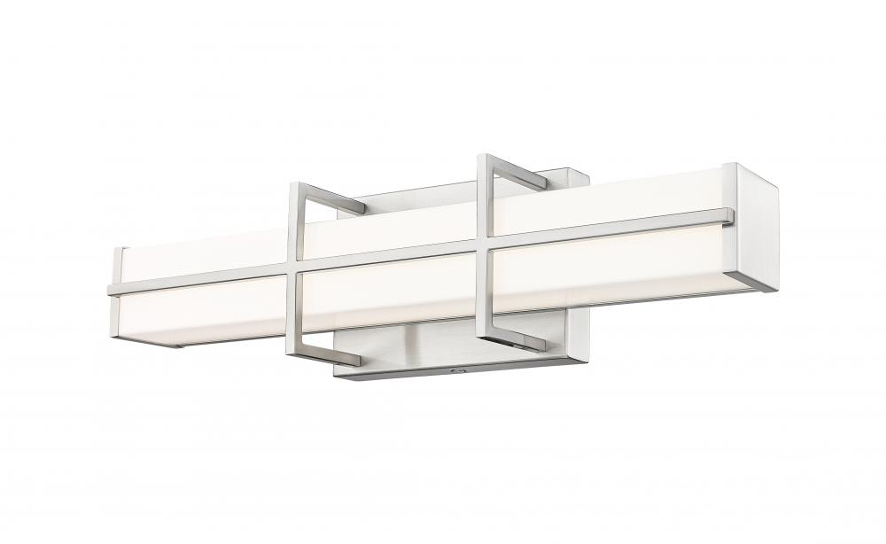 An intricately crafted bracket creates an elegant hint of industrial character for a modern one-light LED vanity light. In brushed nickel with a frosted diffuser, its a linear design complete with vertical and horizontal elements that create contrast and depth. Bright, dimmable illumination shines through the frosted shade, creating soft, true lighting perfect for grooming and ambiance.