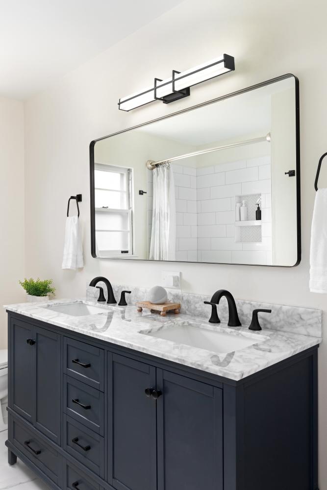 Simplicity sets the tone for the Harrison dimmable LED bath light. Its long, linear profile is perfect over your sink and counter, offering bright, even illumination with selectable color temperature to create the perfect ambiance for you. A rectangular diffuser is frosted for even illumination while a stylish bracket design sports a rich matte black finish for a crisp, versatile look in your bathroom.