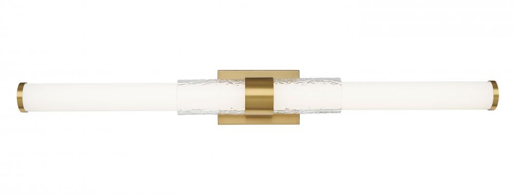 With its golden finish and sculpted glass, this wide vanity light glows like morning sun across a still surface. The elongated form makes a statement, while the soft light flatters from every angle. This fixture is effortlessly warm and undeniably refined.