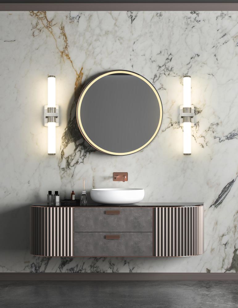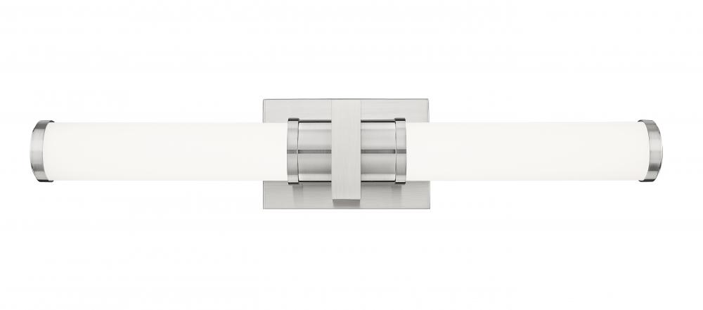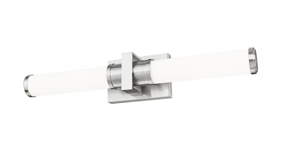 A square cuff adds decorative flair to the clean lines of this modern LED vanity bath light. Its brushed nickel finish complements in virtually any space, while cylindrical opal glass shades diffuse lighting to create a soft glow. The LED light is dimmable and energy efficient to bring your home into the 21st century in both style and technology.