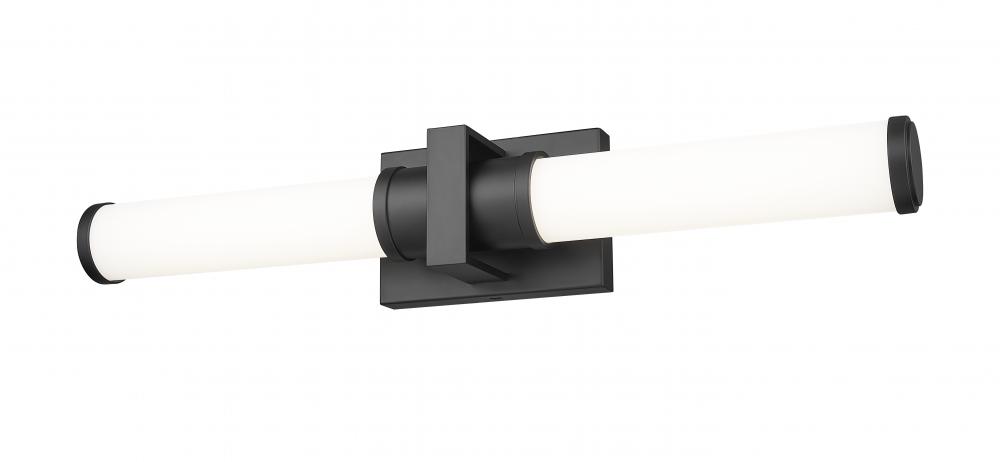 Suited to a contemporary space, this modern LED vanity bath light is the perfect upgrade for a primary or guest suite. It features a chic matte black finish wall plate with a square cuff that adds visual interest to a cylindrical shade silhouette. Opal glass adds contrast while diffusing energy efficient illumination from the fixtures integrated, dimmable LED light source.