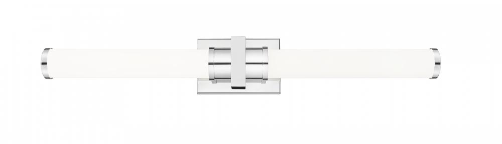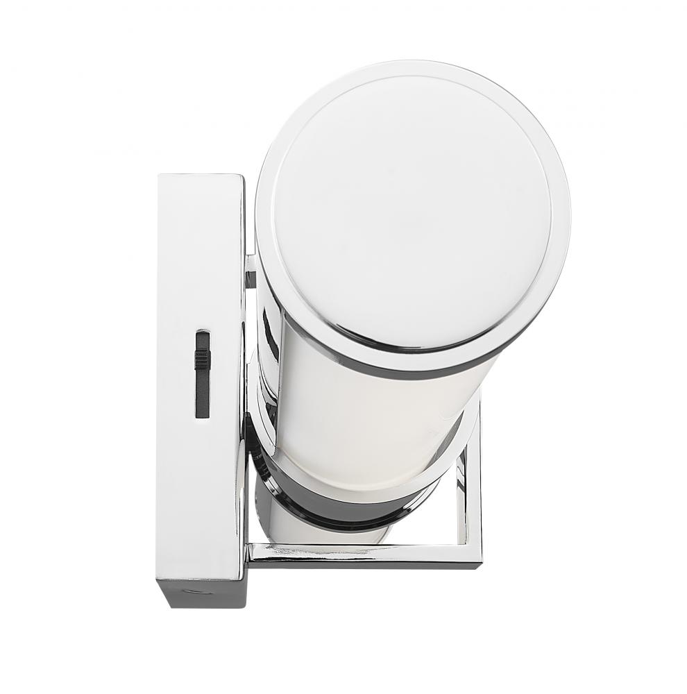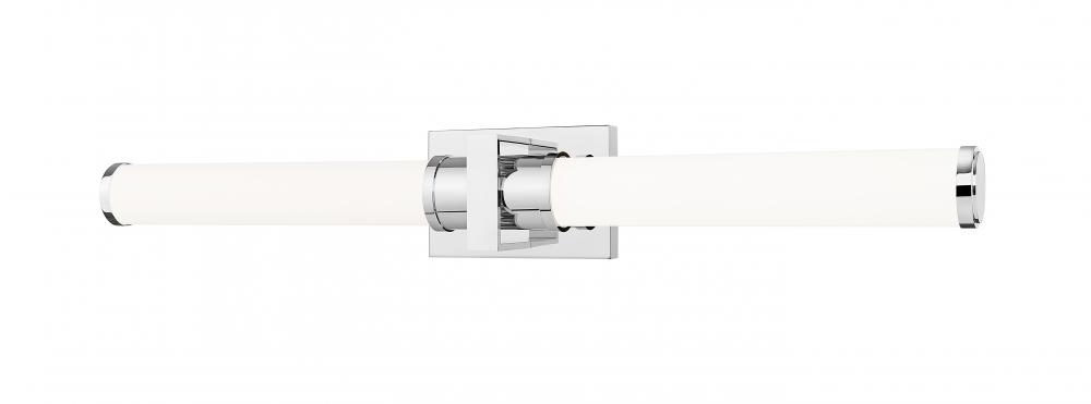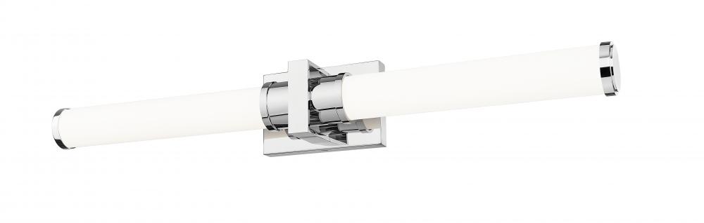 A bright, gleaming chrome finish brings maximum versatility to this modern LED vanity bath light. Its cylindrical opal glass shades are enhanced with a decorative square cuff and rectangular wall plate, offering crisp, fresh style and sophistication. The fixture includes an integrated LED light source, which is dimmable and includes five selectable color options to create just the right ambiance.