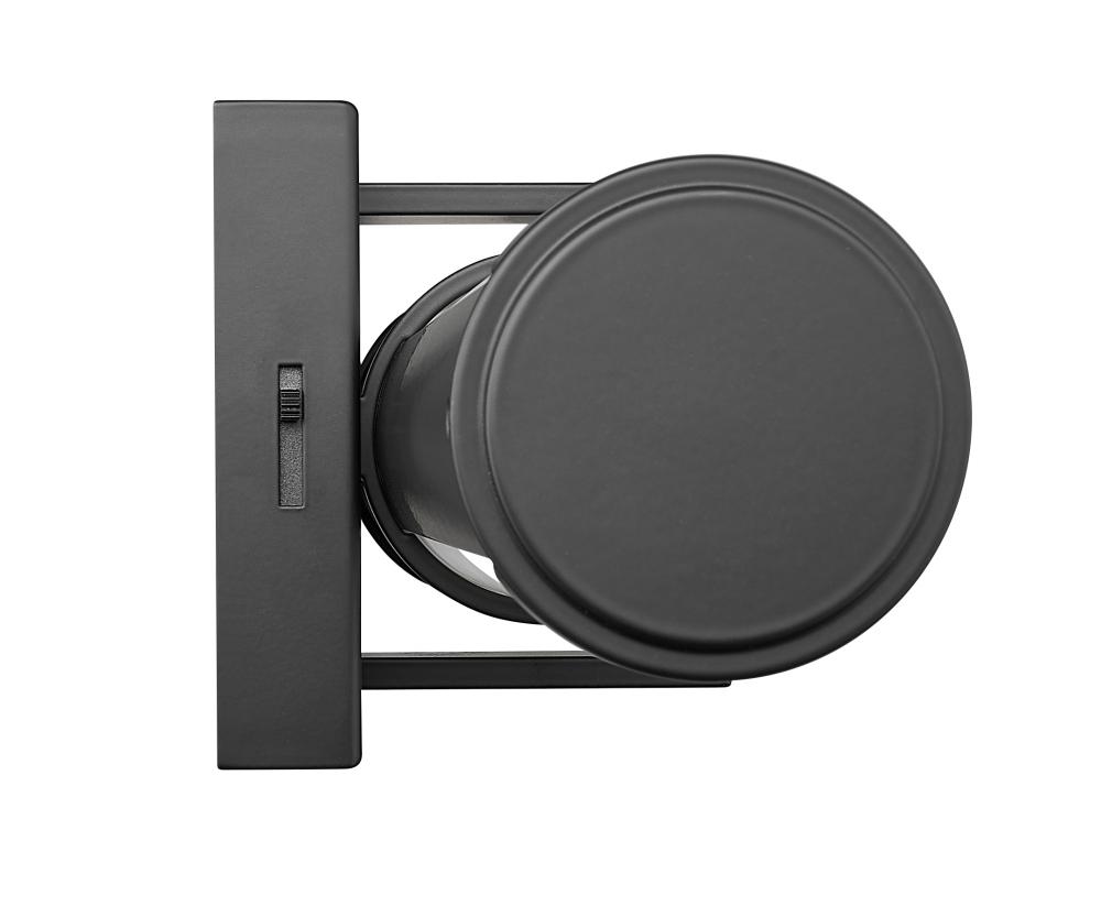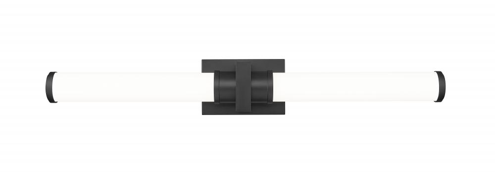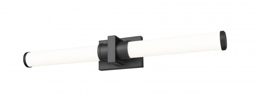 A decorative cuff and end caps in a crisp matte black finish create bold contrast and depth for this modern LED vanity bath light. A pair of cylindrical shades are made from opal glass, elegantly softening illumination from an integrated LED light source. The light is dimmable and color selectable, adding easy custom ambiance to your bath.