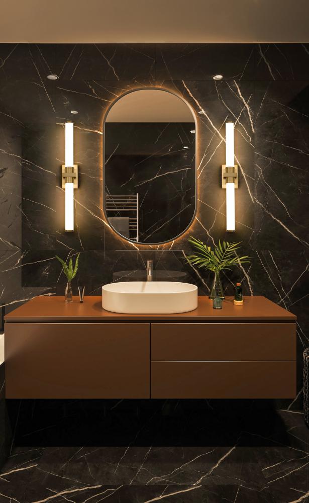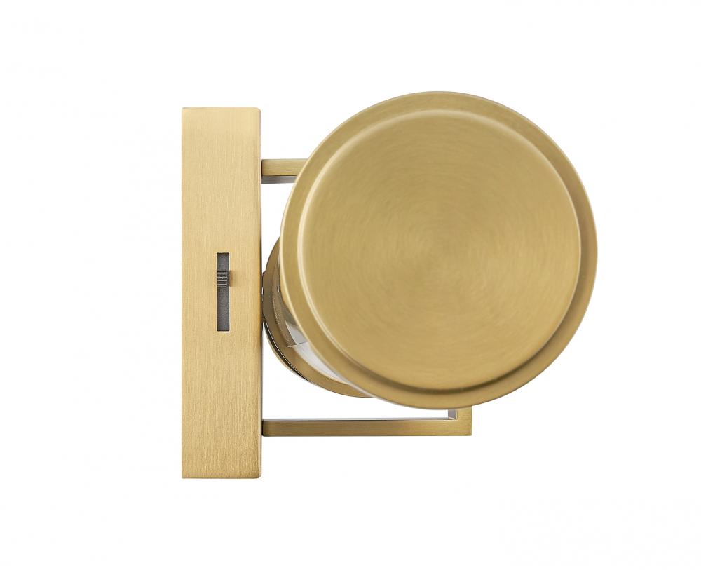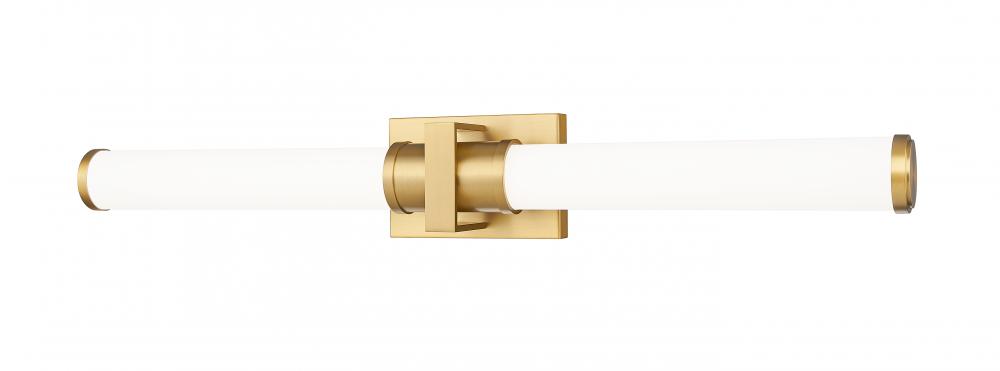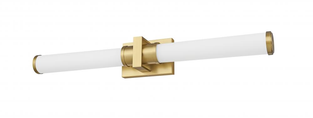 Sophisticated modern gold creates richness and warmth for a modern LED vanity bath light. Chic in a primary or guest en suite, it features a steel wall plate, decorative cuff, and end caps, adding dimension and character to the smooth opal glass cylinders that diffuse its illumination. The LED light is energy efficient and dimmable, perfect for an eco-friendly home.